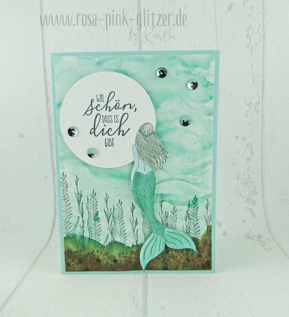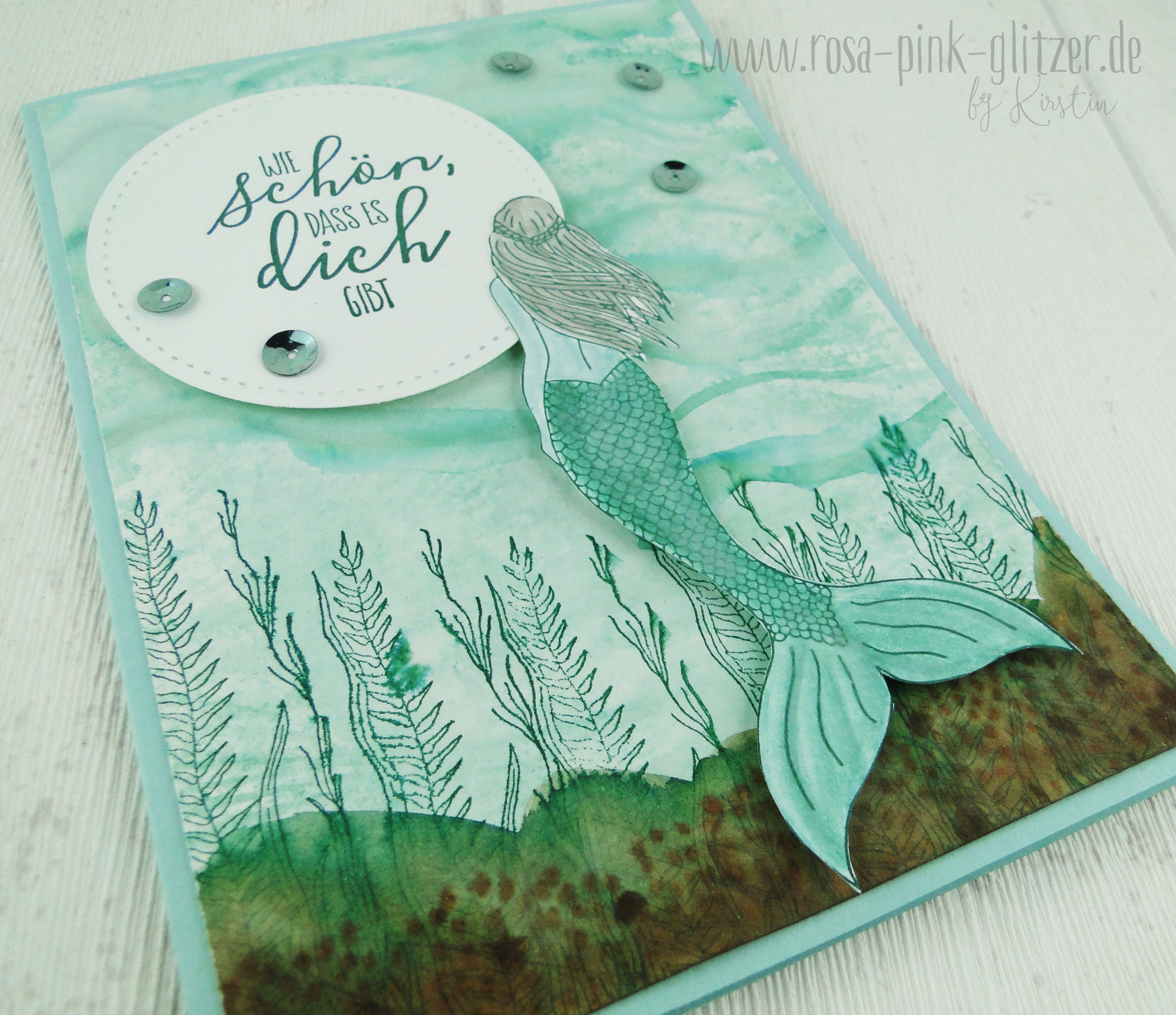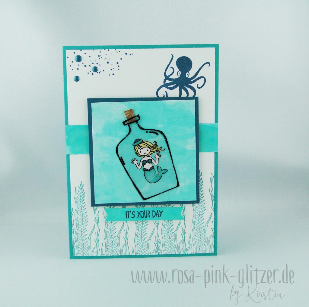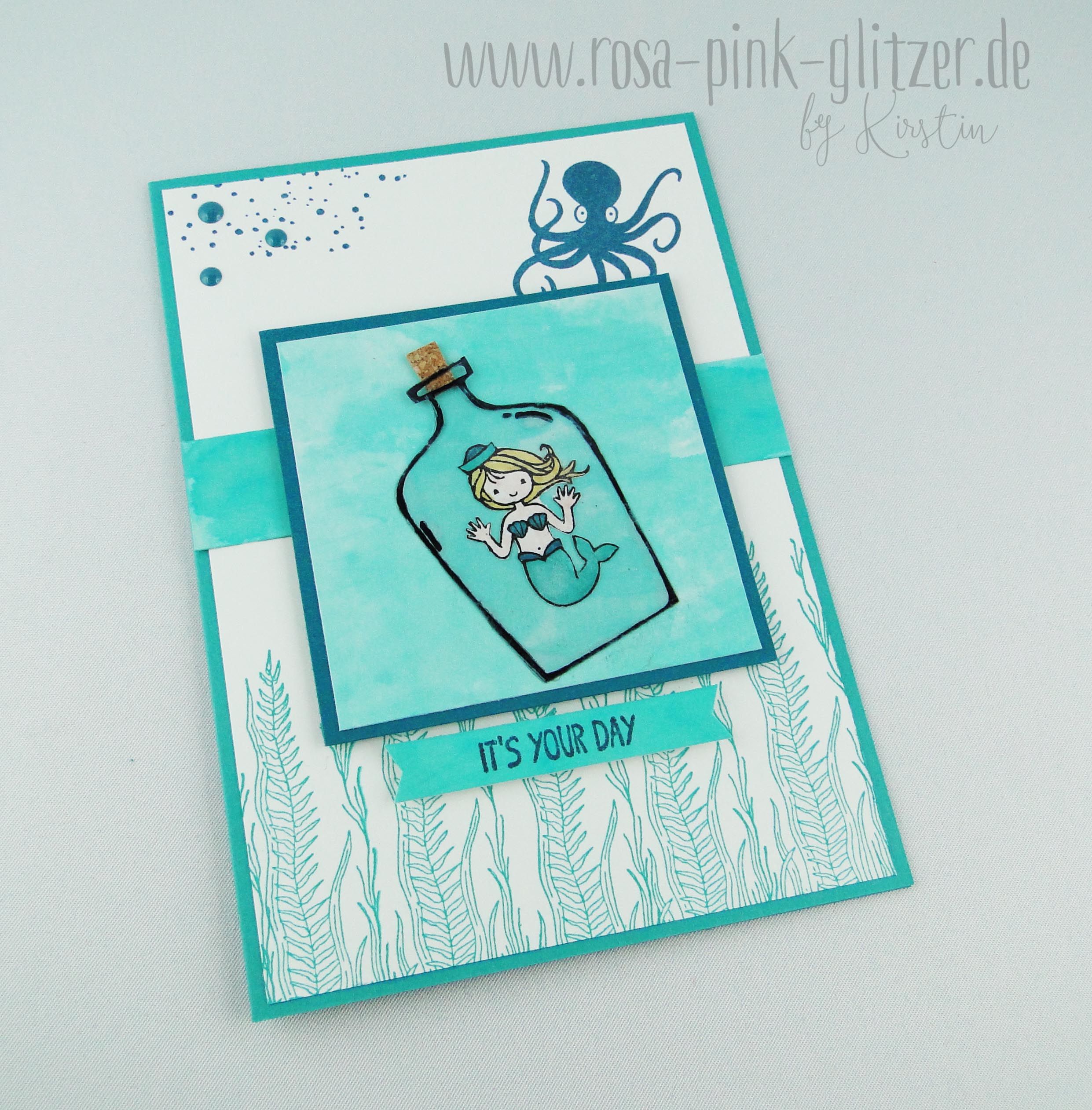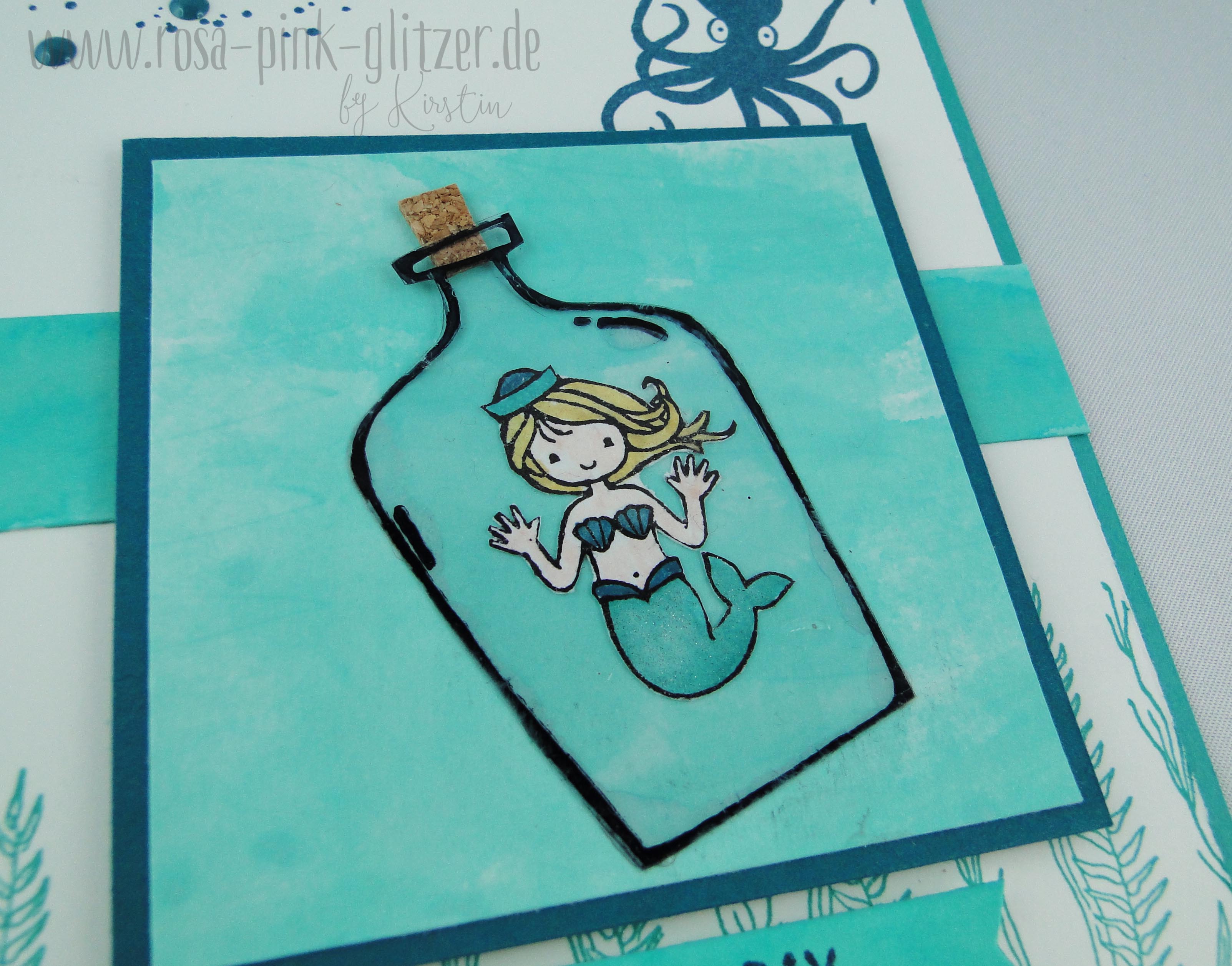 Nun aber wieder zurück zur Karte: Die Deko ist gar nicht so viel bei mir. Neben der Glitzer-Meerjungfrau noch ein Spruch aus dem Stempelset „Message in a bottle“ – ebenfalls im neuen Stampin up Katalog zu finden. Ich hab ihn auf ein Wellen-Fähnchen gestempelt, das ich mit Goldfolie unterlegt hab. Alles mit Dimensionals aufgeklebt, dazu noch ein paar Pailletten – und fertig ist die Unterwasser-Karte. Die Meerjungfrau wird diese Woche übrigens nochmal durch meinen Blog schwimmen, seid gespannt 😉