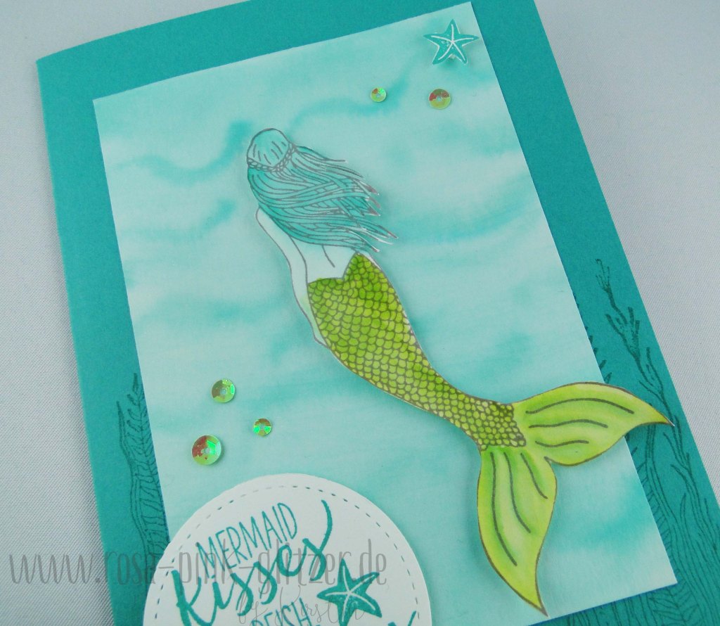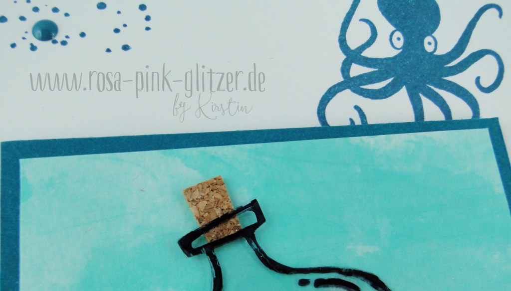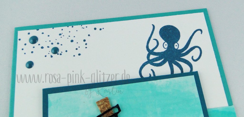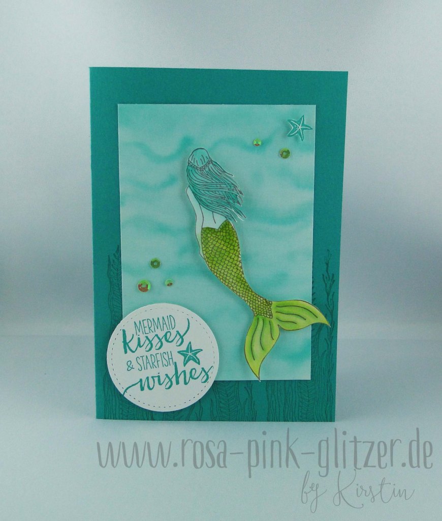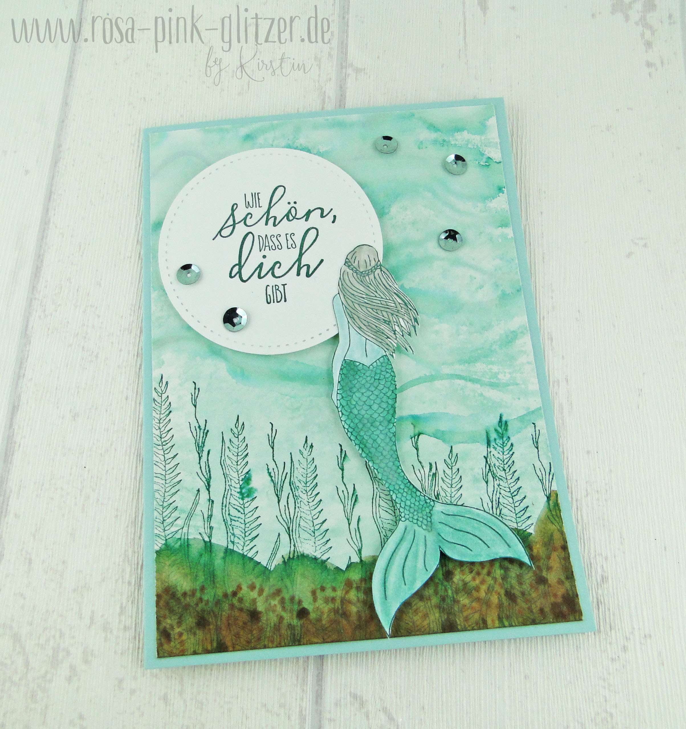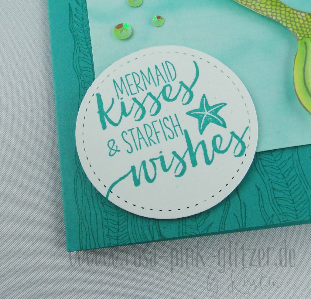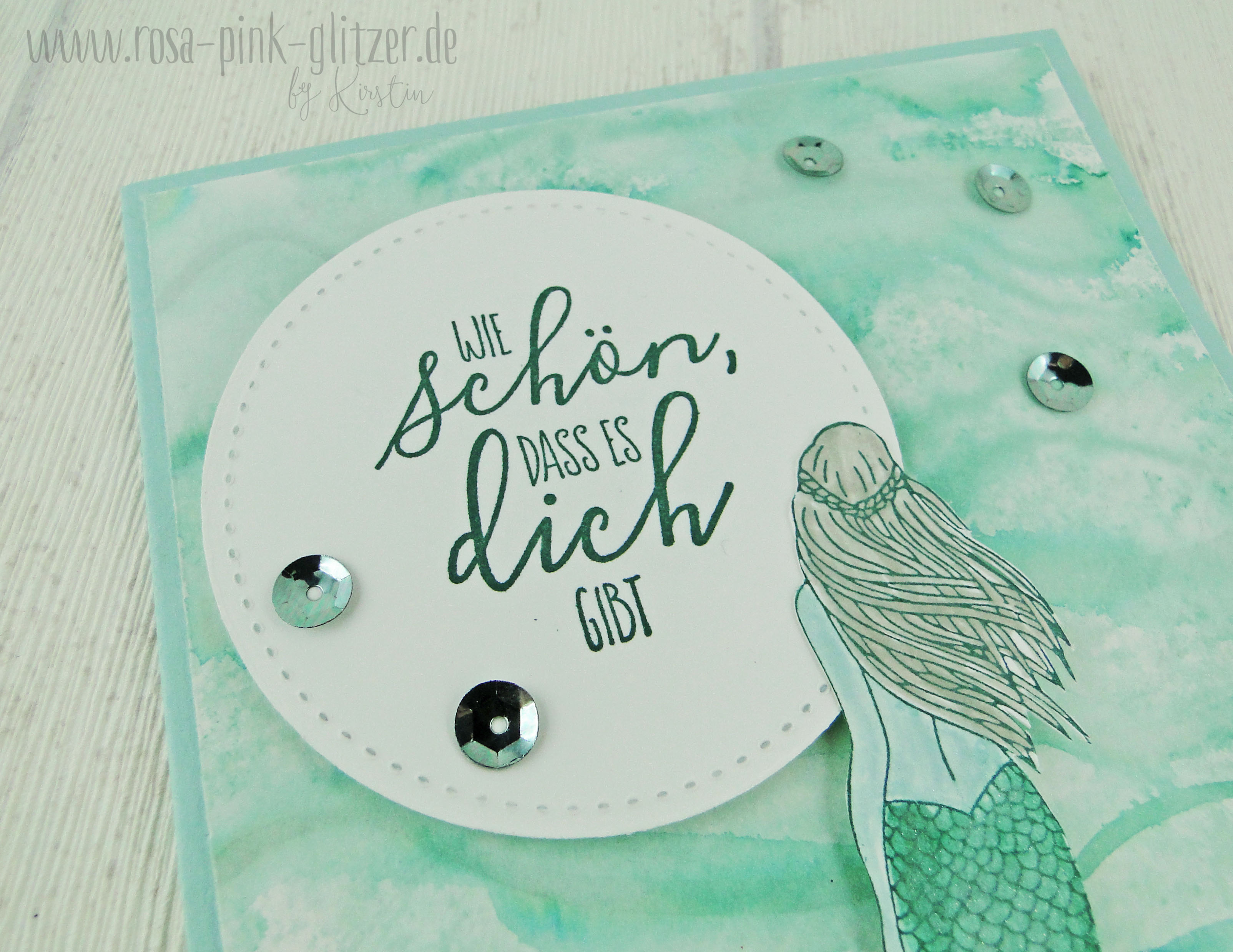 Nun aber wieder zurück zur Karte: Die Deko ist gar nicht so viel bei mir. Neben der Glitzer-Meerjungfrau noch ein Spruch aus dem Stempelset „Message in a bottle“ – ebenfalls im neuen Stampin up Katalog zu finden. Ich hab ihn auf ein Wellen-Fähnchen gestempelt, das ich mit Goldfolie unterlegt hab. Alles mit Dimensionals aufgeklebt, dazu noch ein paar Pailletten – und fertig ist die Unterwasser-Karte. Die Meerjungfrau wird diese Woche übrigens nochmal durch meinen Blog schwimmen, seid gespannt 😉