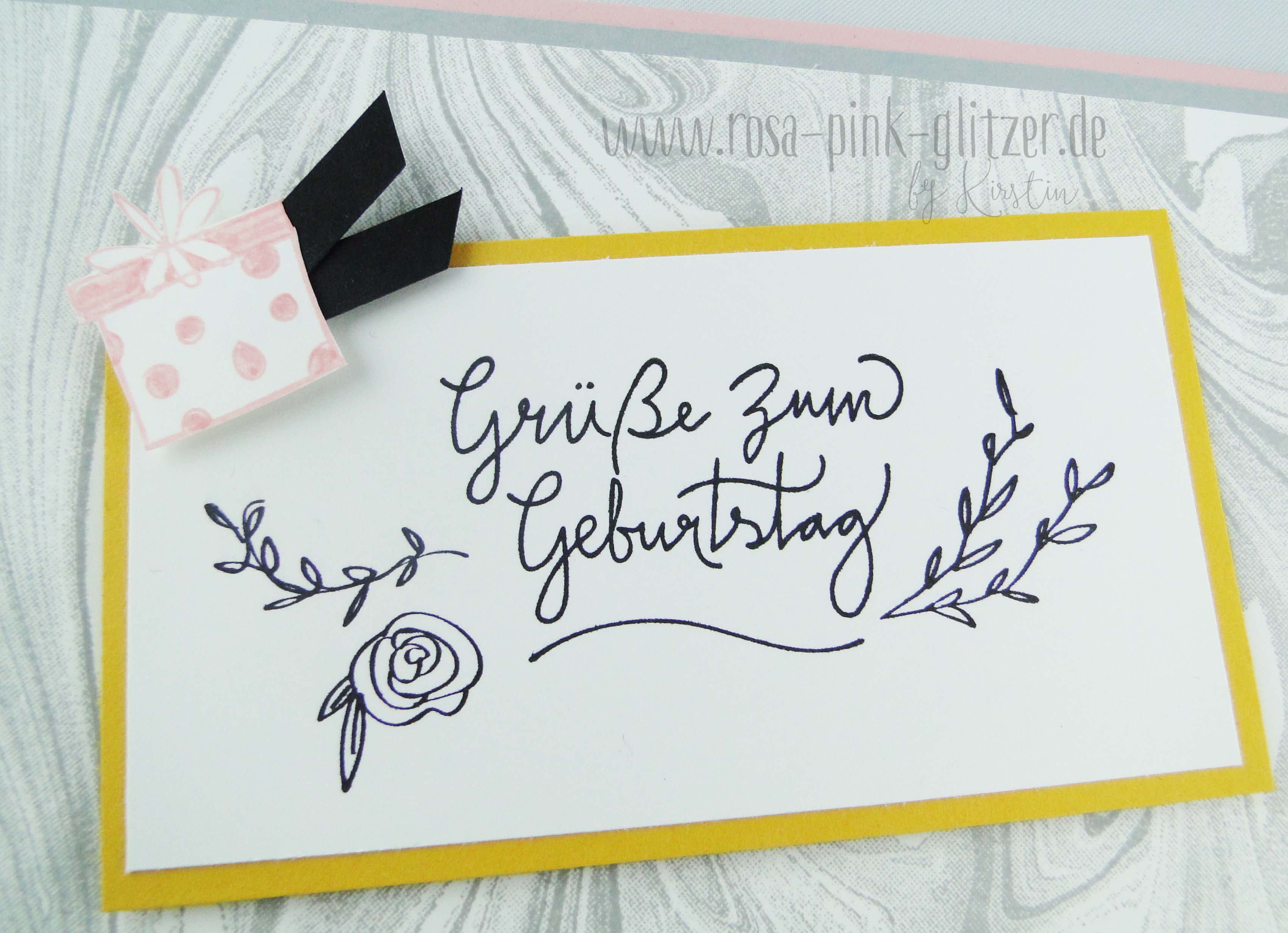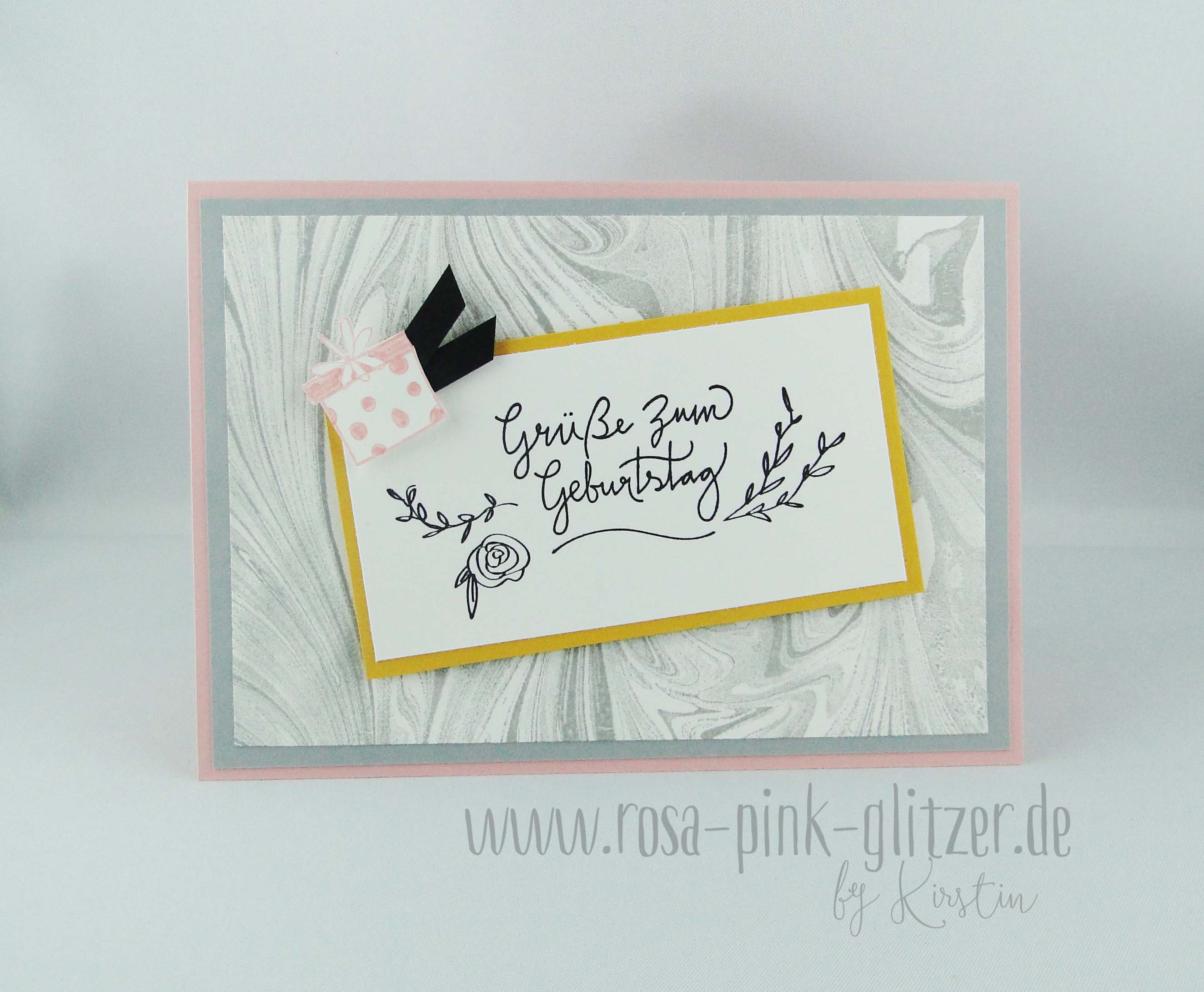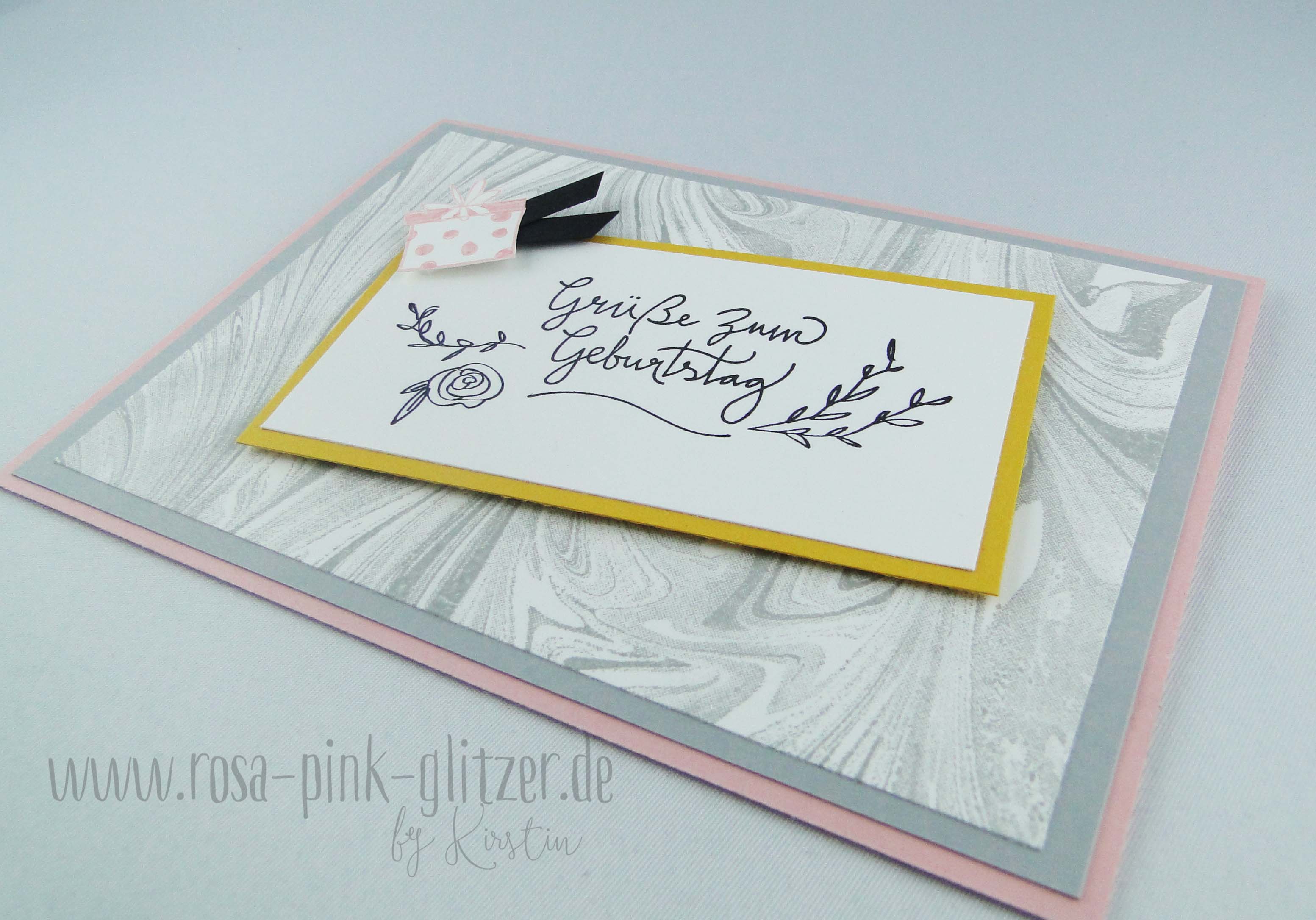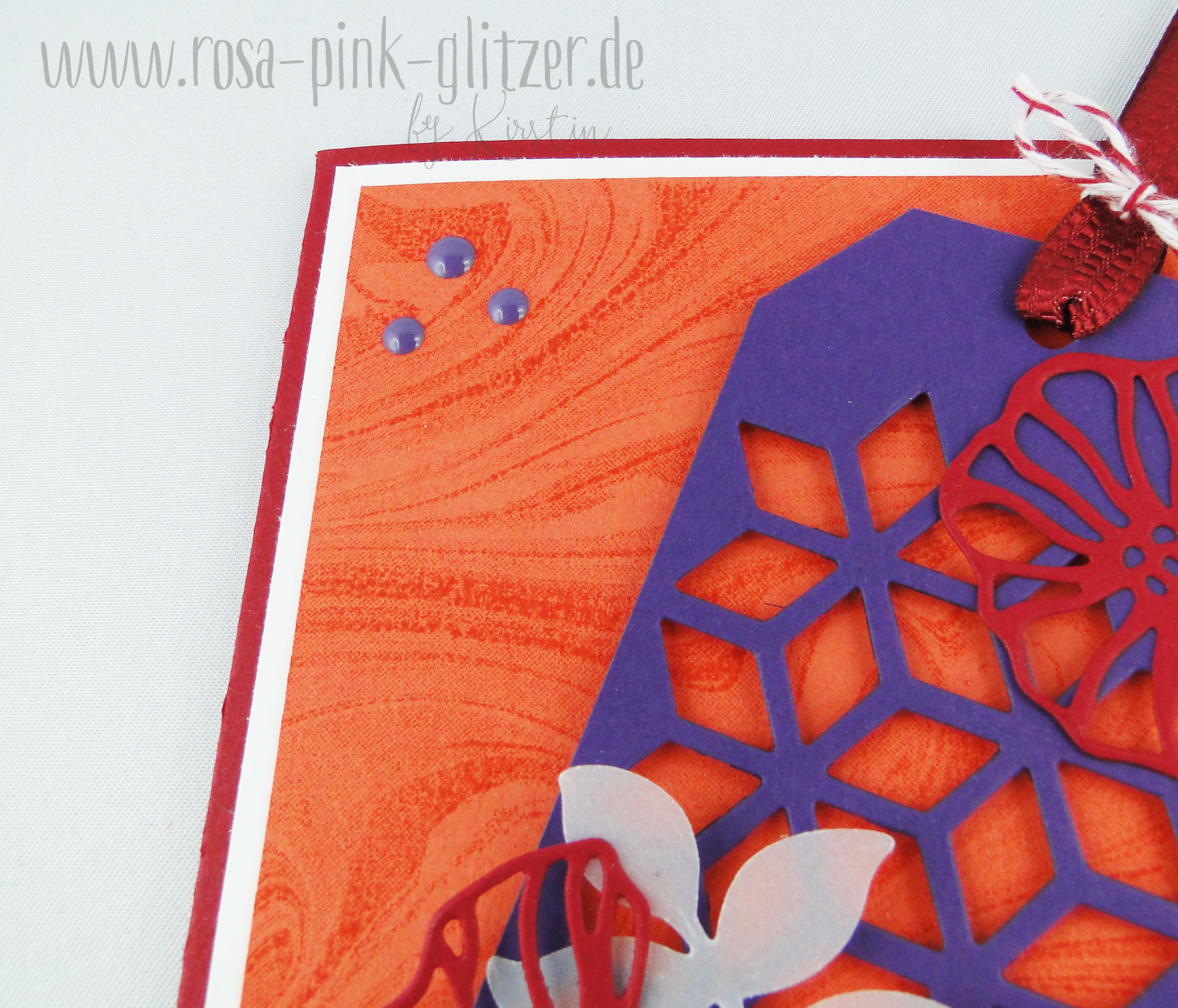 Der Hintergrund wurde mit dem Hintergrundstempel „Marbled“ aus dem Stampin up Jahreskatalog gestempelt. Was für ein Effekt! Das Schildchen hab ich mit in Aubergine geschnitten und die Gitter-Thinlits „Kreative Vielfalt“ eingesetzt. Dadurch entsteht dieses hübsche Muster. Ebenfalls aus den Thinlits stammen die Blumen (gestanzt in Chili) sowie der Blätterzweig (gestanzt aus Pergament).