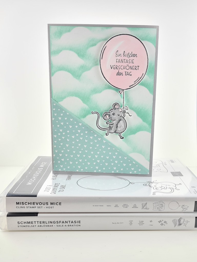 Ich habe Euch hier schon gezeigt, wie der Wolkenhintergrund gemacht wird. Die Mäuse stammen aus dem GastgeberInnenset „Mischievous Mice“, Papier und Spruch stammen aus der Sale-a-Bration.