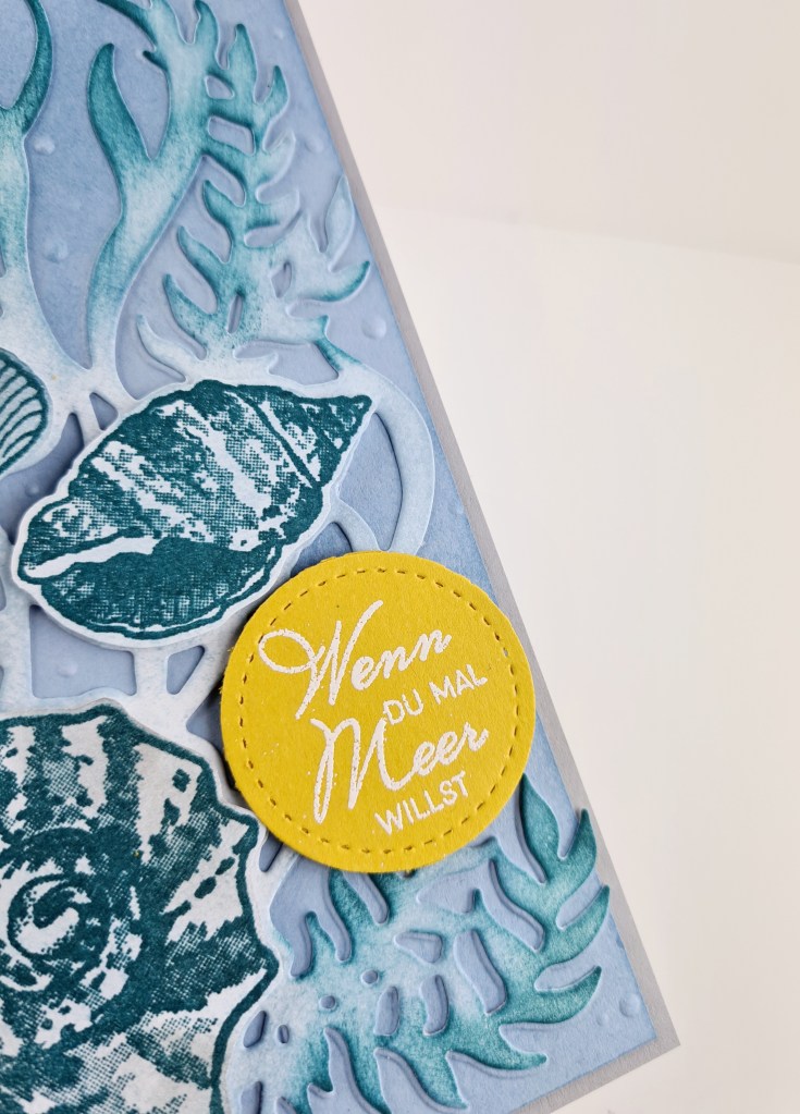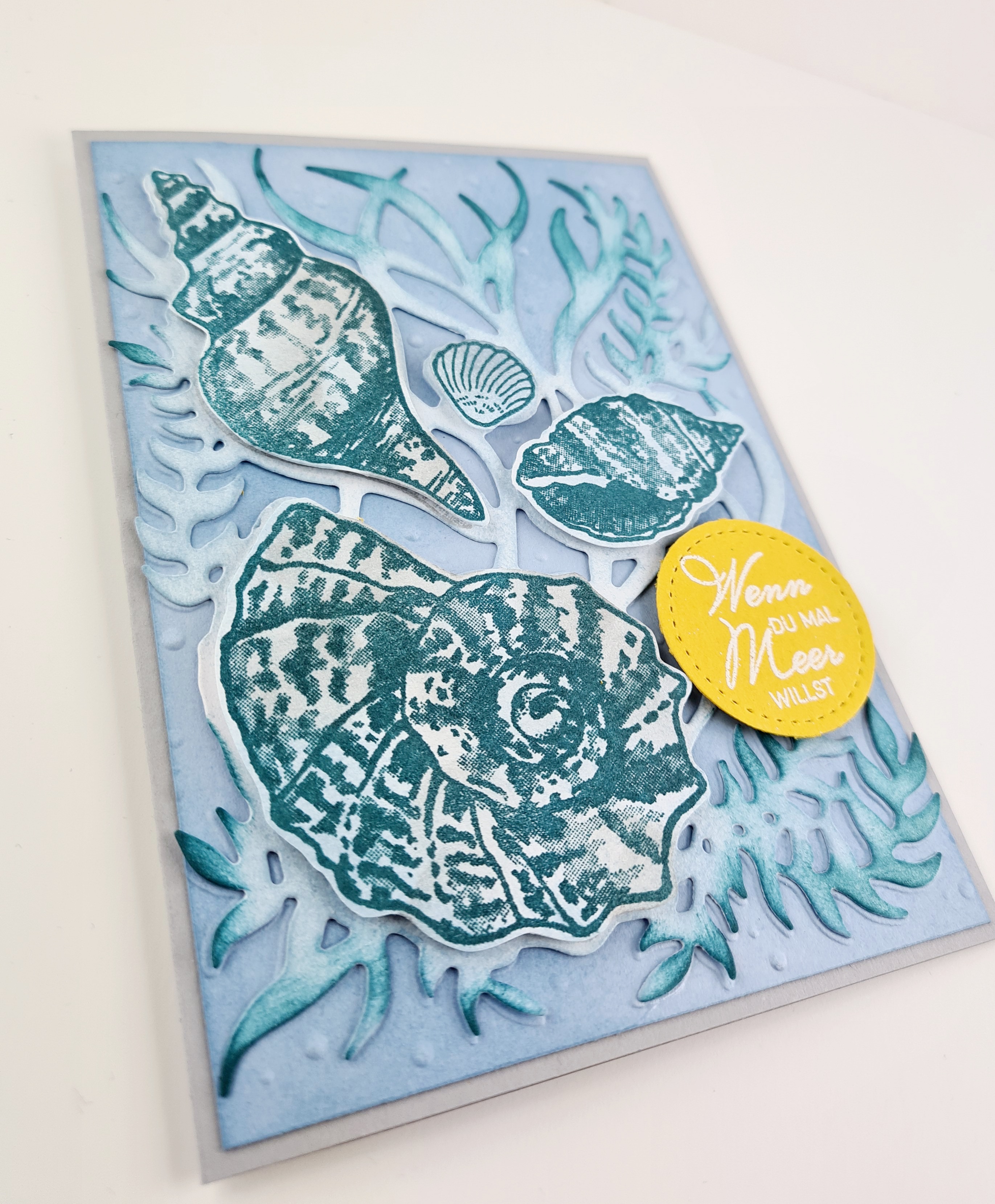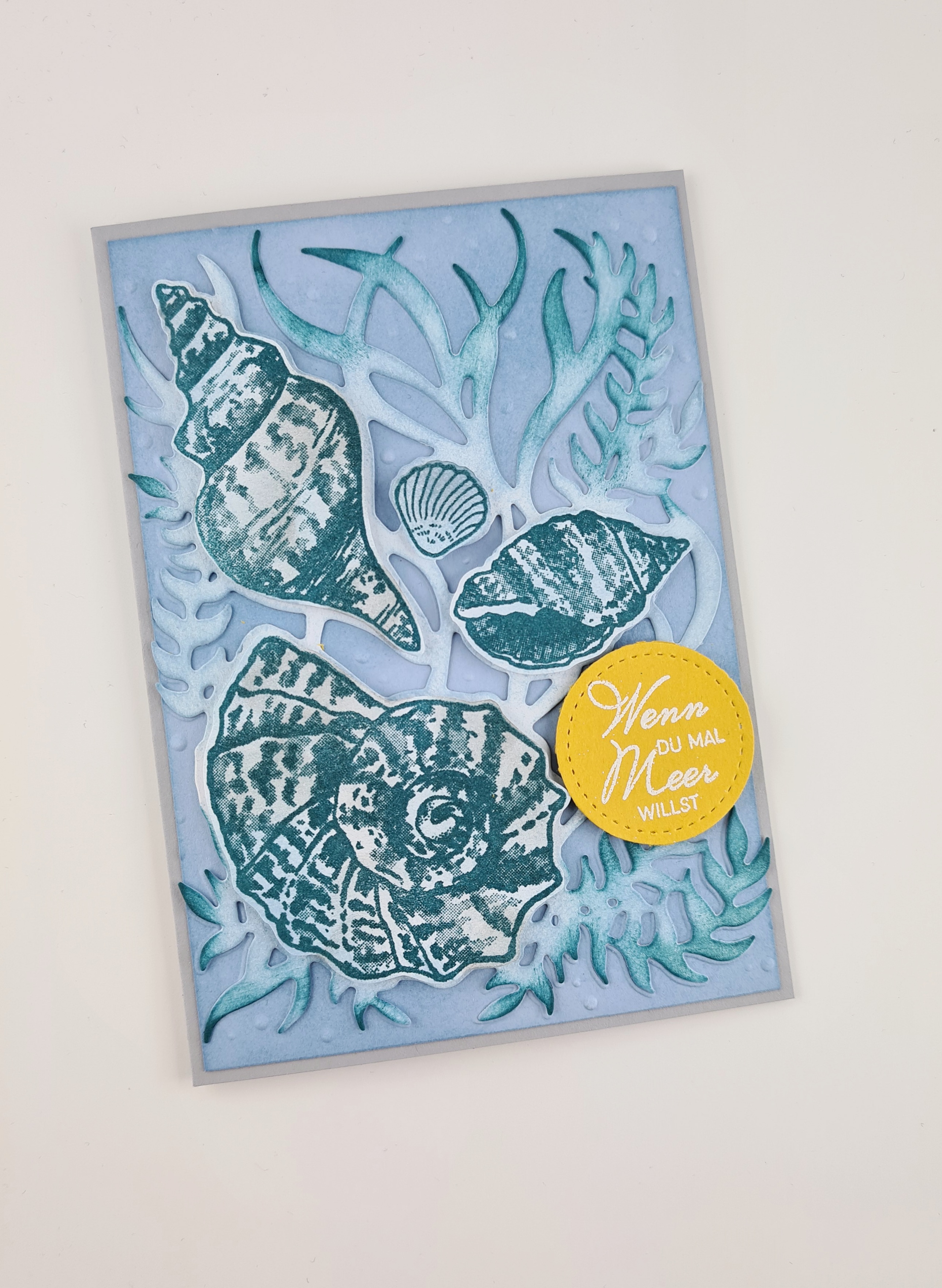 Die Muscheln hab ich extra gestempelt und dann mit Dimensionals aufgeklebt. Vorher hatte ich sie direkt draufgestempelt, so gefällt es mir aber besser. Die Pflanzen hab ich mit einem Schwämmchen gewischt.