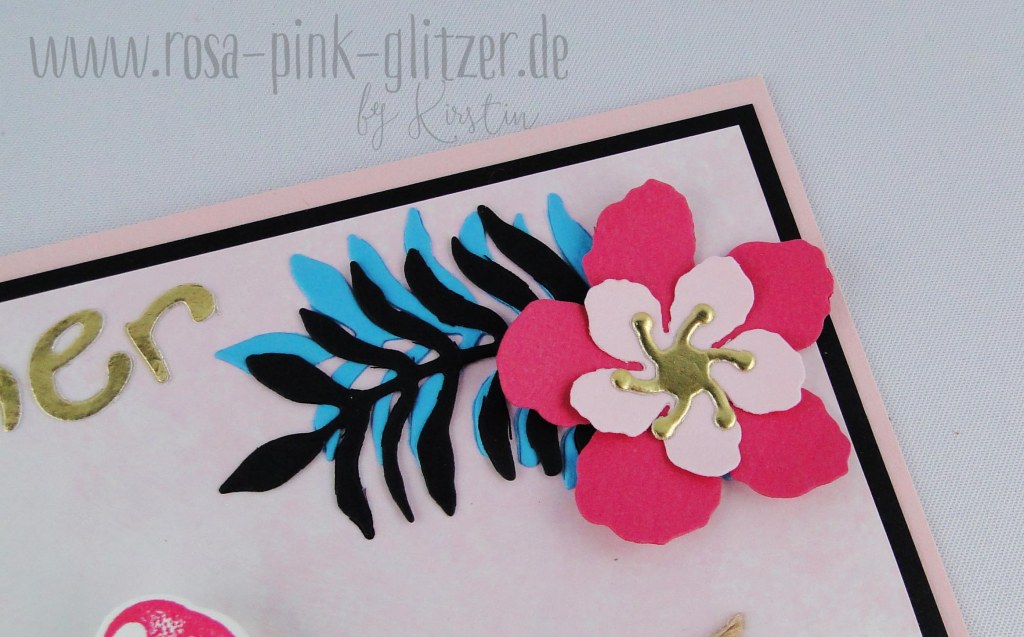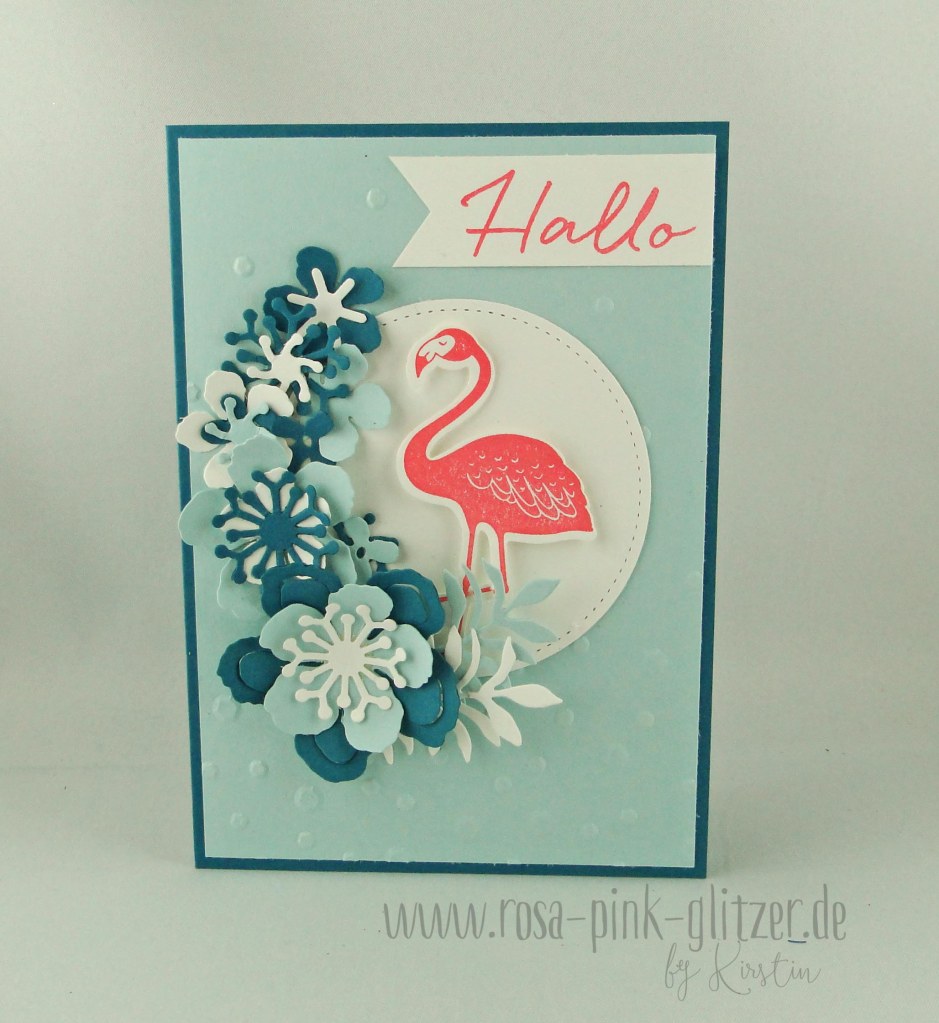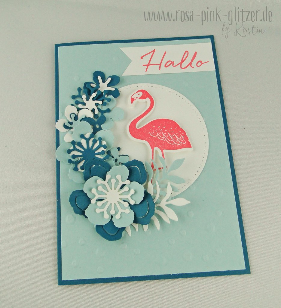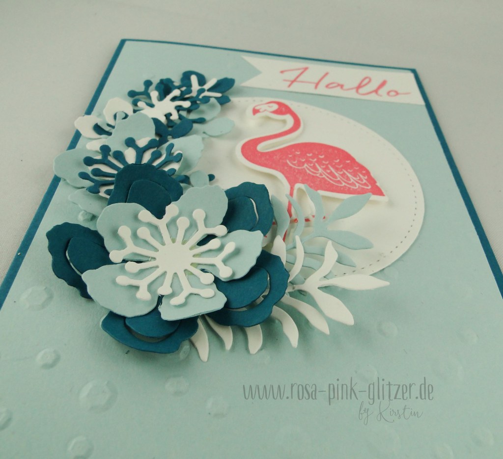 Ich mag diese Art von Karten so gerne. Tropische Blätter, ein Flamingo… hier seht ihr auch den neuen Prägefolder von Stampin up. Der ist so cool und vor allem so groß! Genial!