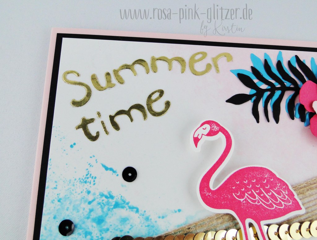 Ich hatte da dieses neue Stempelset von Stampin up in meinem Fundus: Sunny Days. Da waren so hübsche Sprüche dabei und grad bei dem Sketch ist das Sentiment ja doch sehr prominent. So, jetzt wisst Ihr: Alles begann mit dem Spruch. Dann kamen die Farben, die Pailletten, der Prägefolder und der Flamingo: