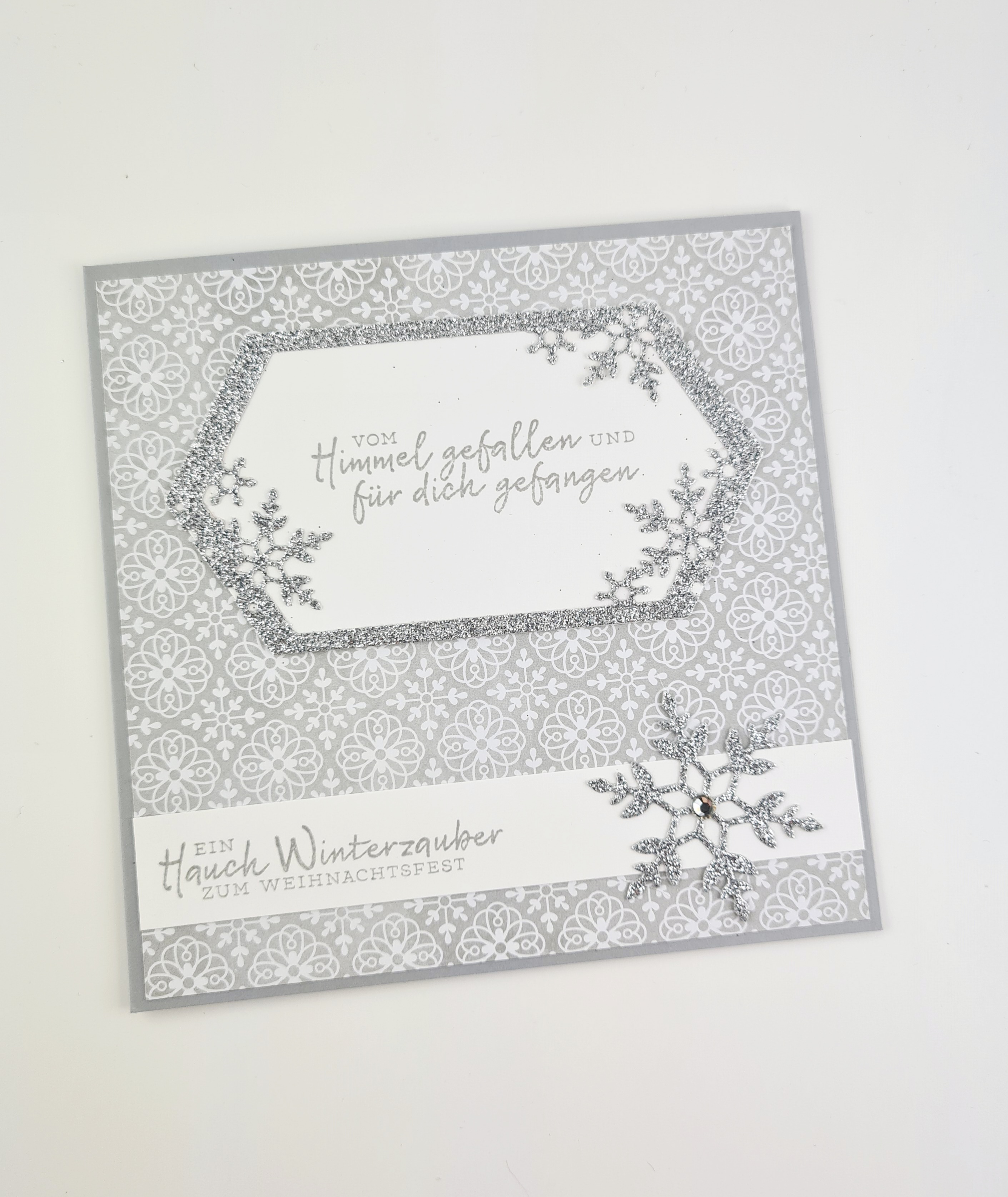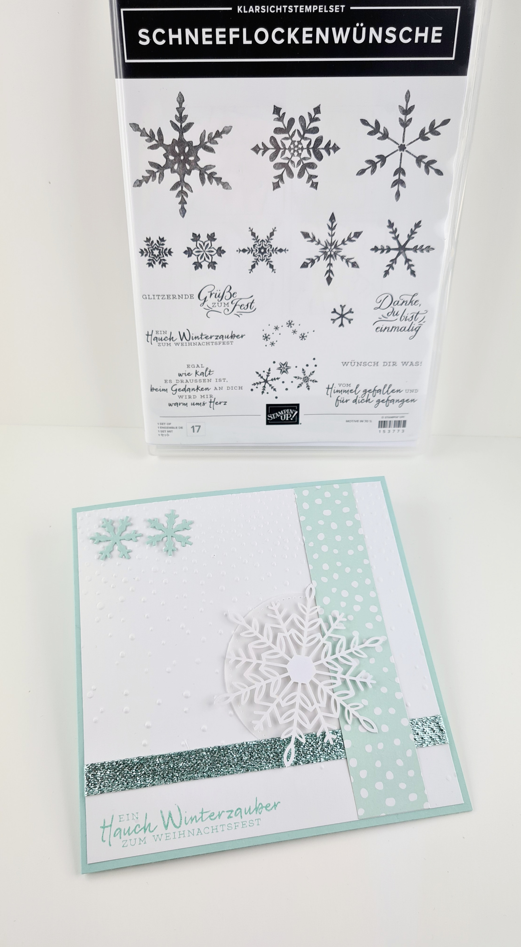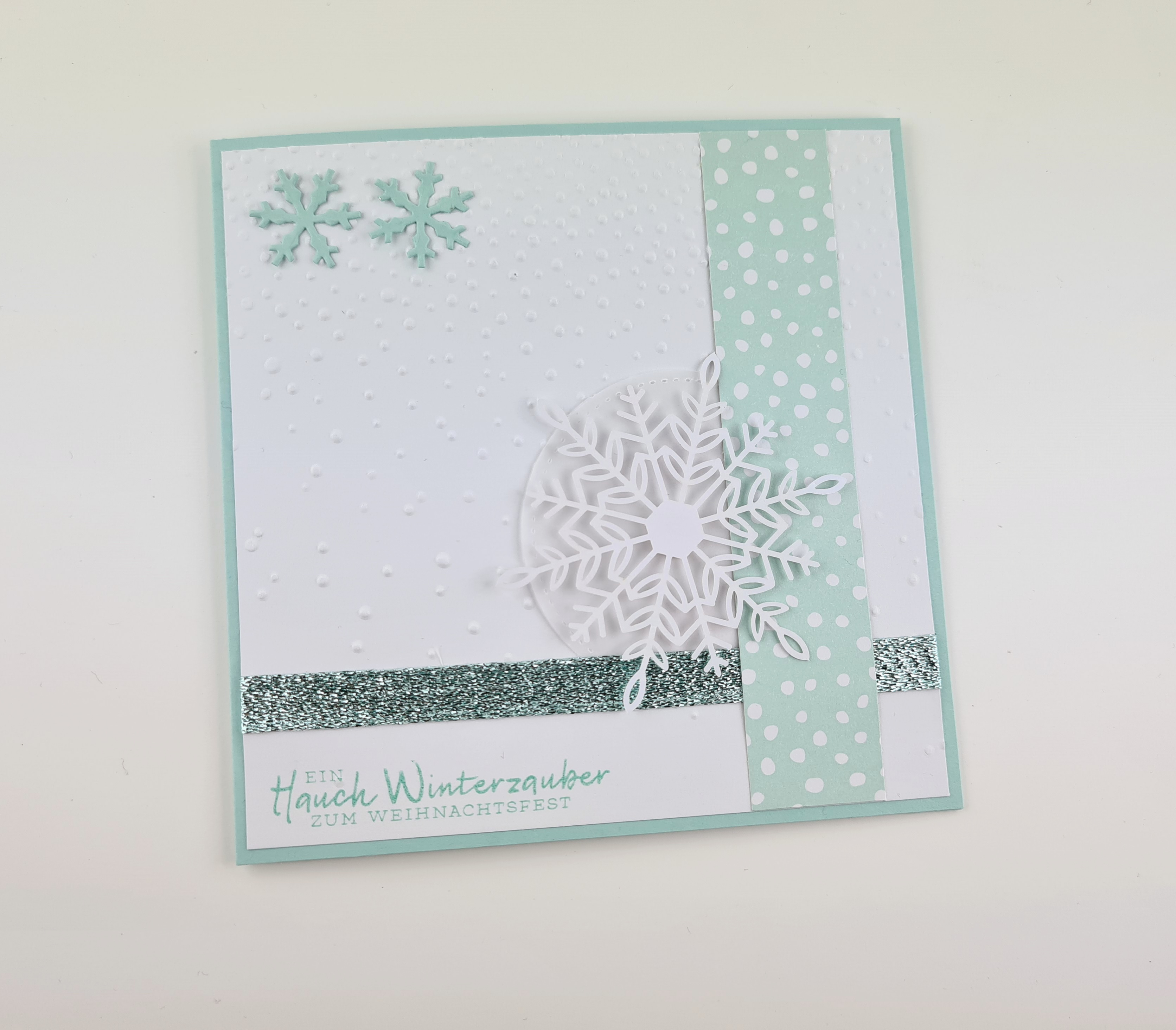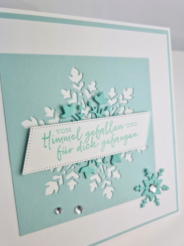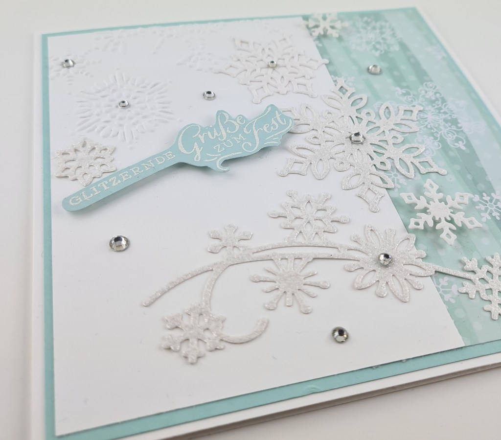 Auch hier kam wieder das wunderhübsch Set Schneeflockenwünsche von Stampin up zum Einsatz, in Kombination mit den passenden Thinlits und einem älteren Designerpapier.