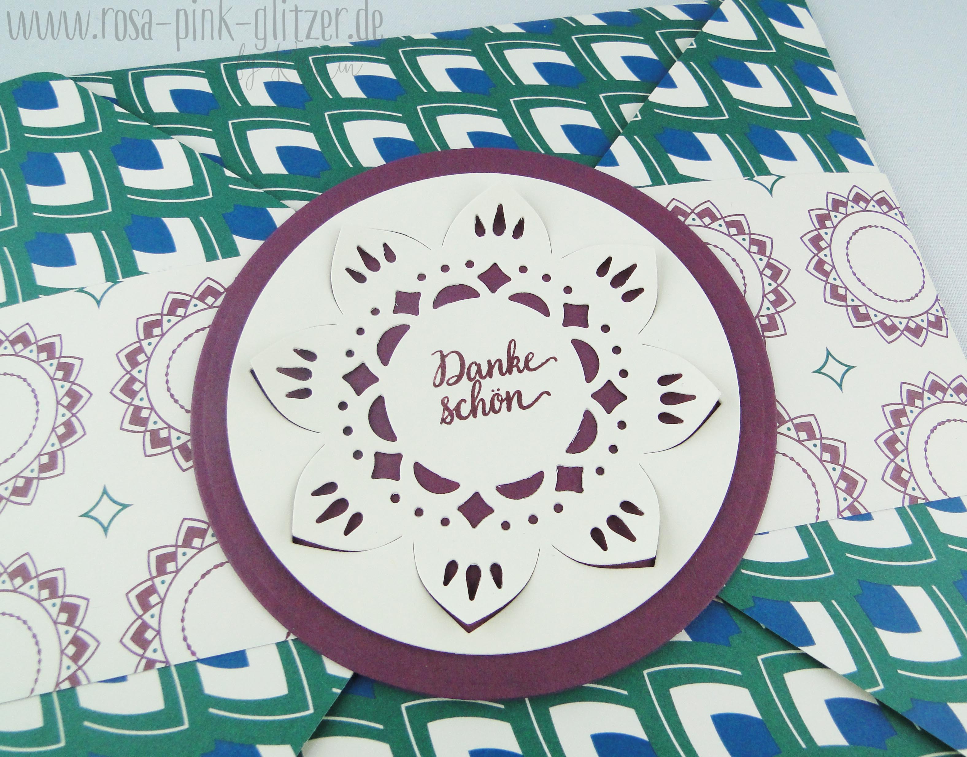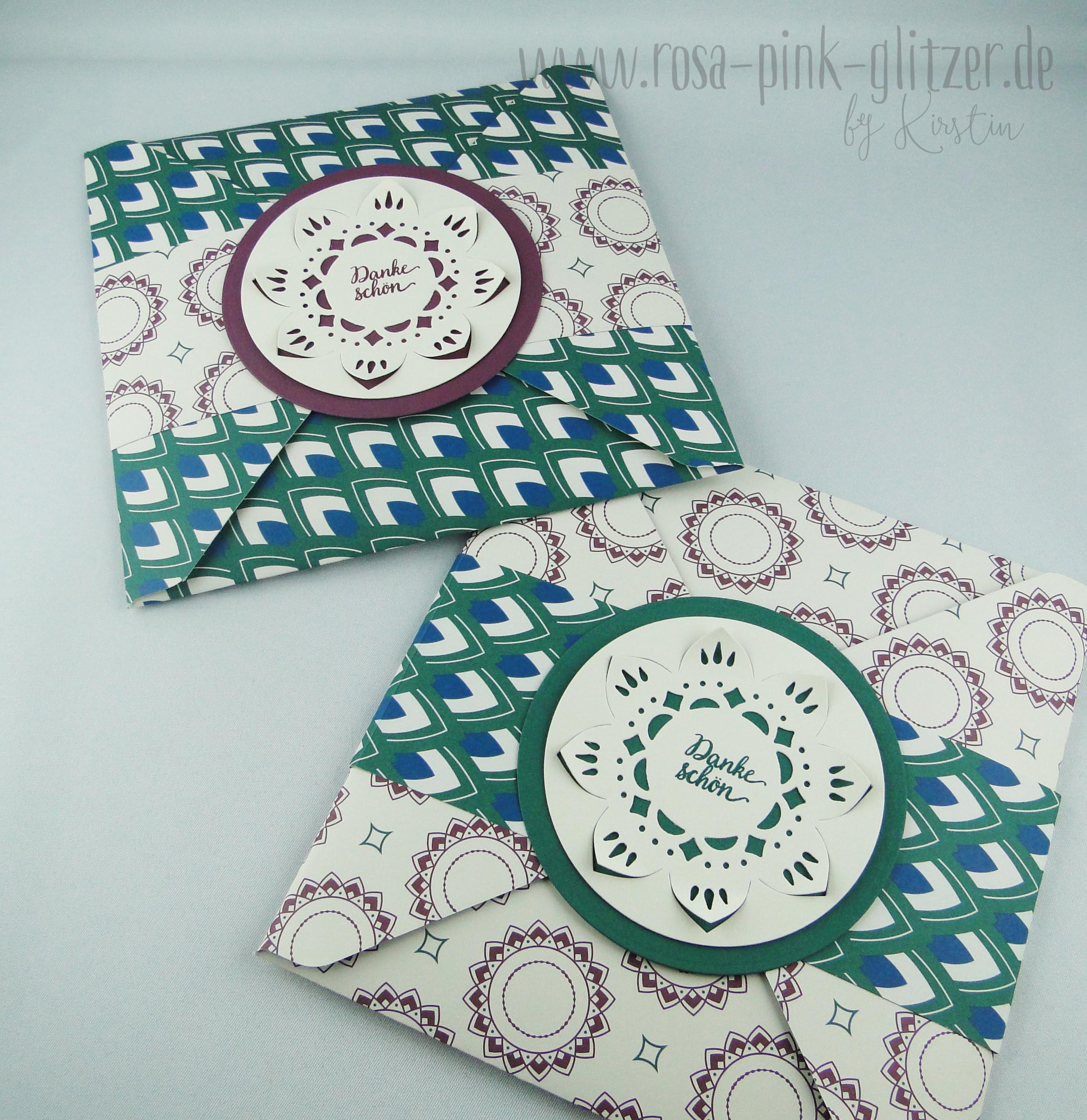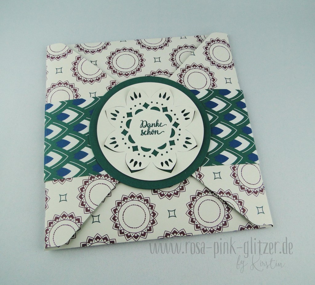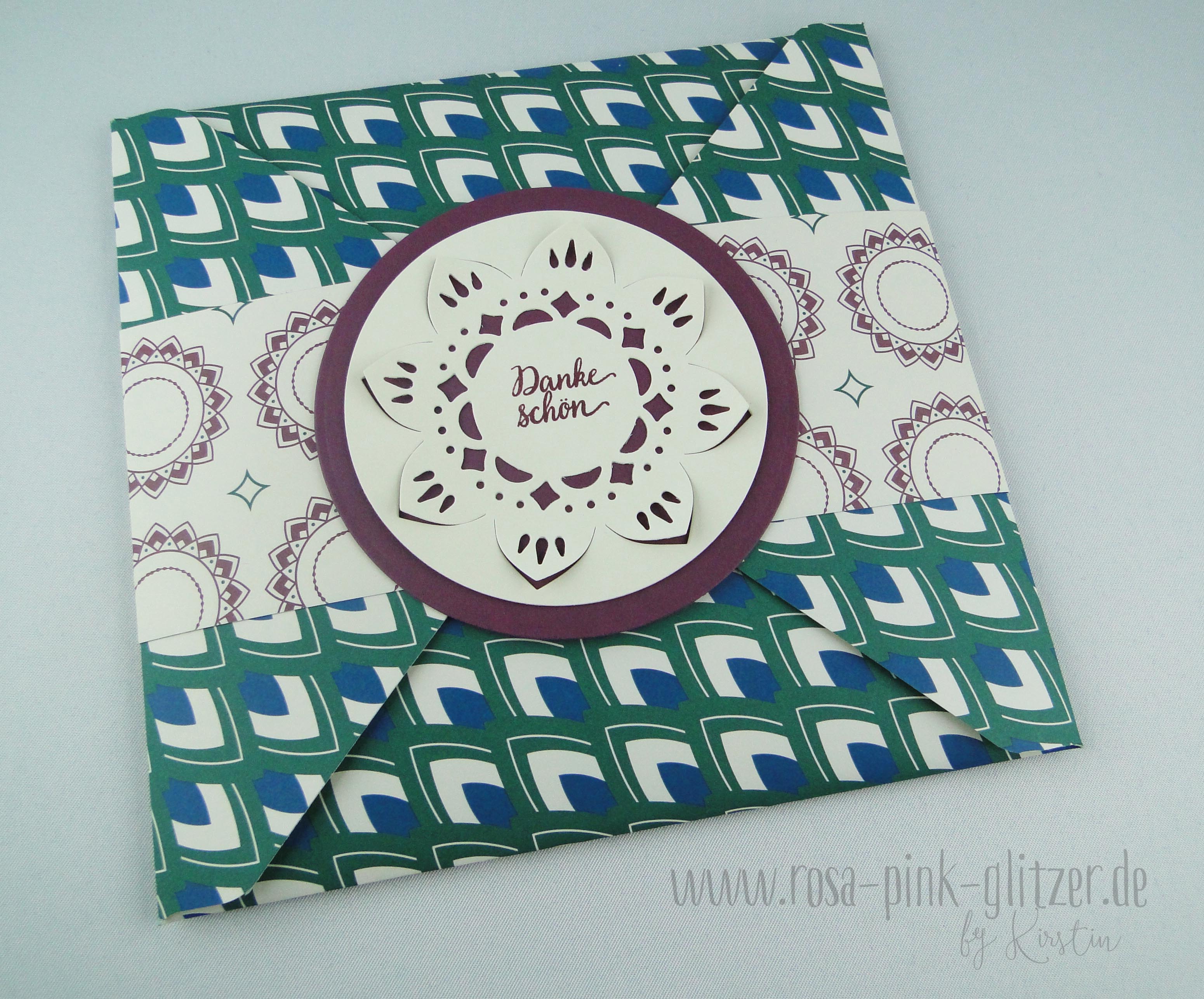 Es gab da mal so ein hübsches „All-inclusive-Set“ im Vorverkauf mit allem drum und dran: Stempelset, Thinlits, Designerpapier, Deko-Klebedinger, Stempelkissen, Quasten… Erst war ich standhaft und dann? Dann wurde es kurz vor Ende der Aktion ins Körbchen gelegt und sofort bestellt und da war es nun. Und lag da und irgendwie waren mir die Thinlits zu kompliziert und mit dem Stempelset allein fiel mir nichts ein und das Papier – ach Mensch, Papier muss man doch erstmal streicheln und überhaupt… Tja, so war meine erste Begegnung mit dem Orient, stempeltechnisch. Und dann hab ich es doch mal genutzt. Erst für Schenklis zu meinem Workshop bei Fräulein Moni und dann für die hübschen Verpackungen und dem Kärtchen, was ich Euch heute zeige.