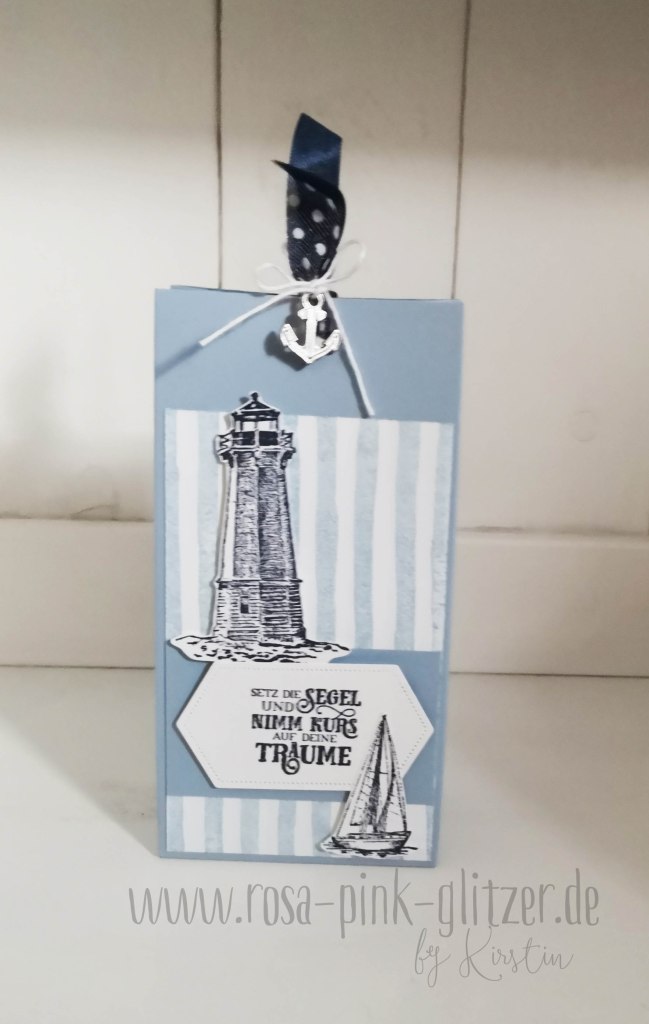 Schiffe und Schriftzug sind embosst, letzteres auf Transparentpapier. Irgendwie hebt es sich damit ein wenig ab, ist aber sehr dezent dabei. Der Hintergrund ist mit Calypso und Aquamarin gemacht, aufgeklebt hab ich auf Blütenrosa. Das passte dann irgendwie am beesten.