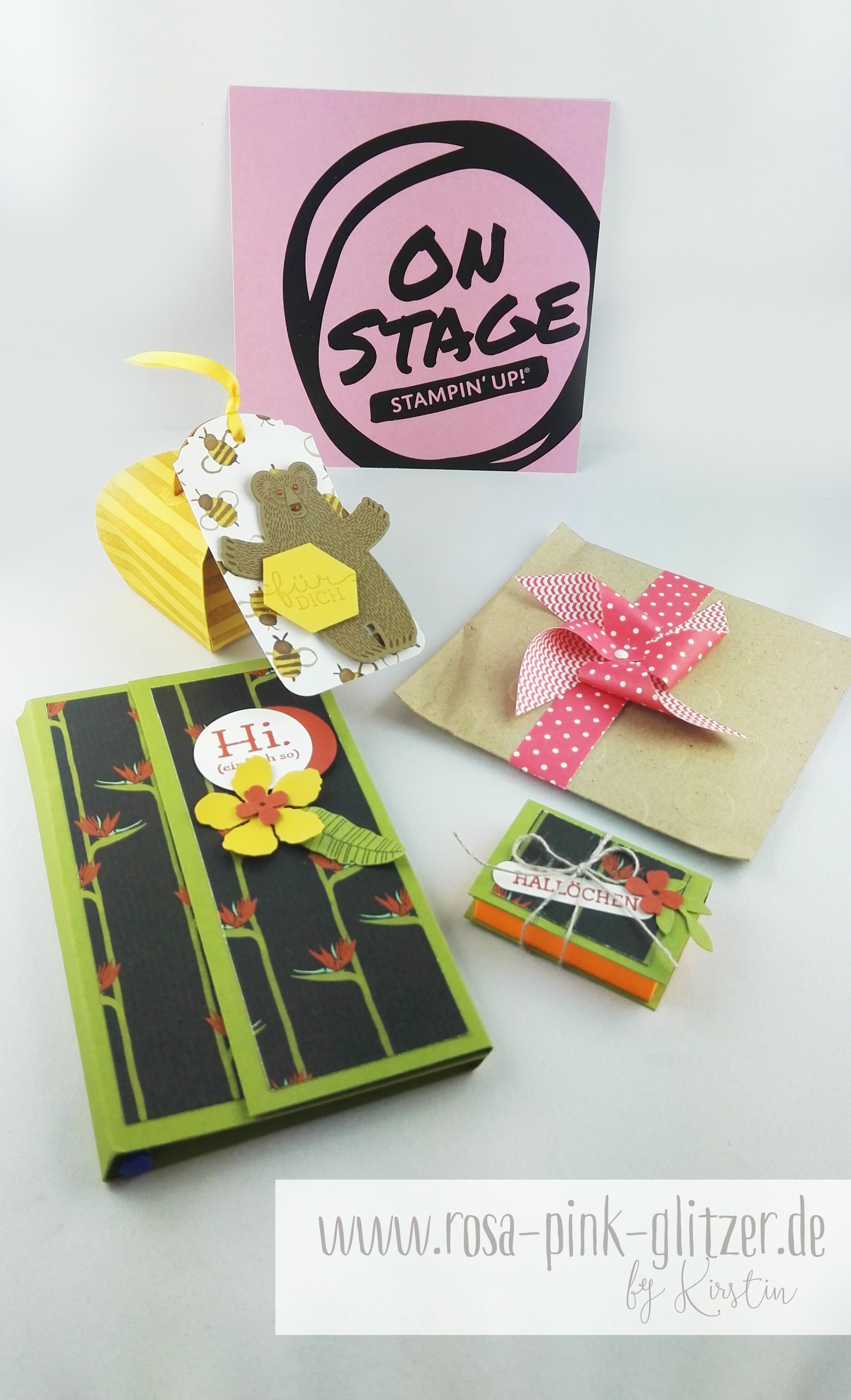 Christina hat uns Honig bärenstark verpackt, Sandra N. hat Dimensionals zauberhaft verpackt und Sandra H. hat dran gedacht, das man für jeden neuen Katalog ein Notizbüchlein und Post-its braucht.