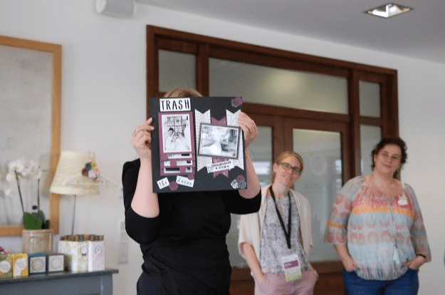 Simone hatte ihre – mega-aufwändigen und wunderschönen – Swaps noch nicht ganz fertig, da hab ich ihr noch ein wenig kleben geholfen. Im Aufsicht führen ist Simone super, wie man auf dem Foto sieht 😉