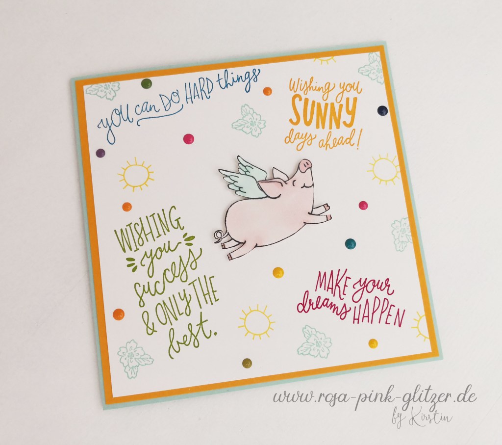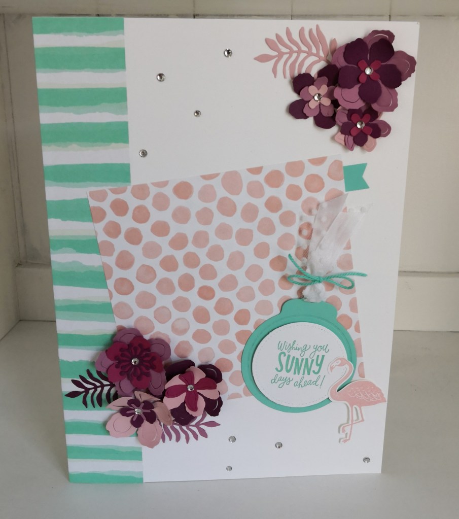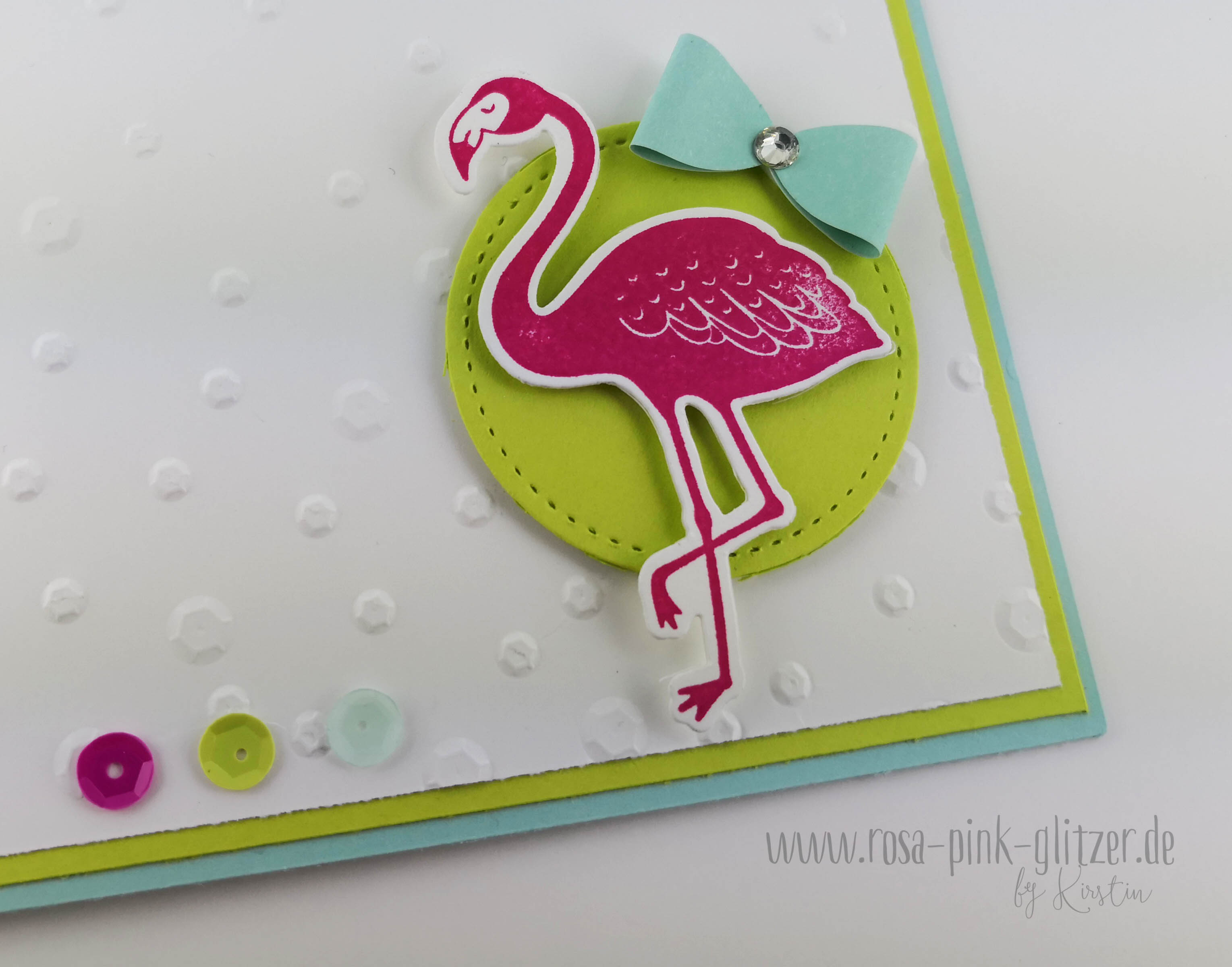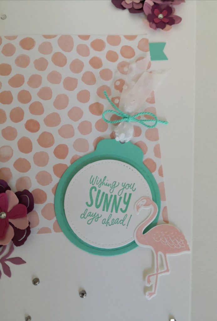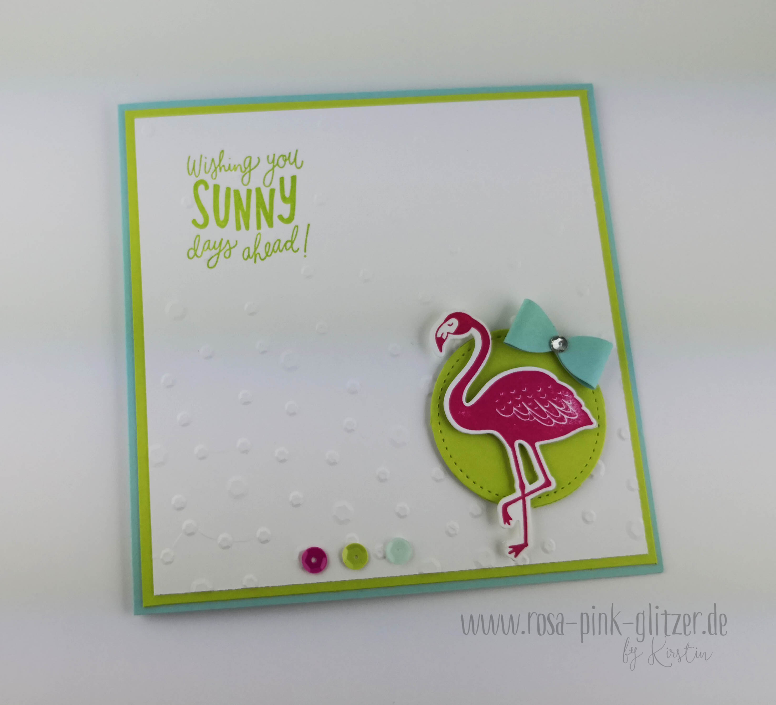 Ich hatte da dieses neue Stempelset von Stampin up in meinem Fundus: Sunny Days. Da waren so hübsche Sprüche dabei und grad bei dem Sketch ist das Sentiment ja doch sehr prominent. So, jetzt wisst Ihr: Alles begann mit dem Spruch. Dann kamen die Farben, die Pailletten, der Prägefolder und der Flamingo: