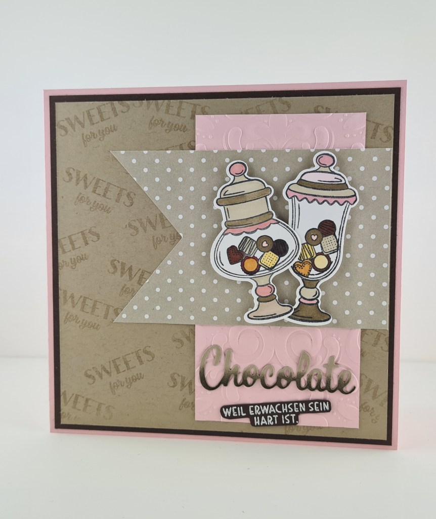 Die zweite Karte ist gedeckter. Ich hab mich dabei von den kleinen Pralinchen inspirieren lassen, die im Süßigkeitenglas stecken.