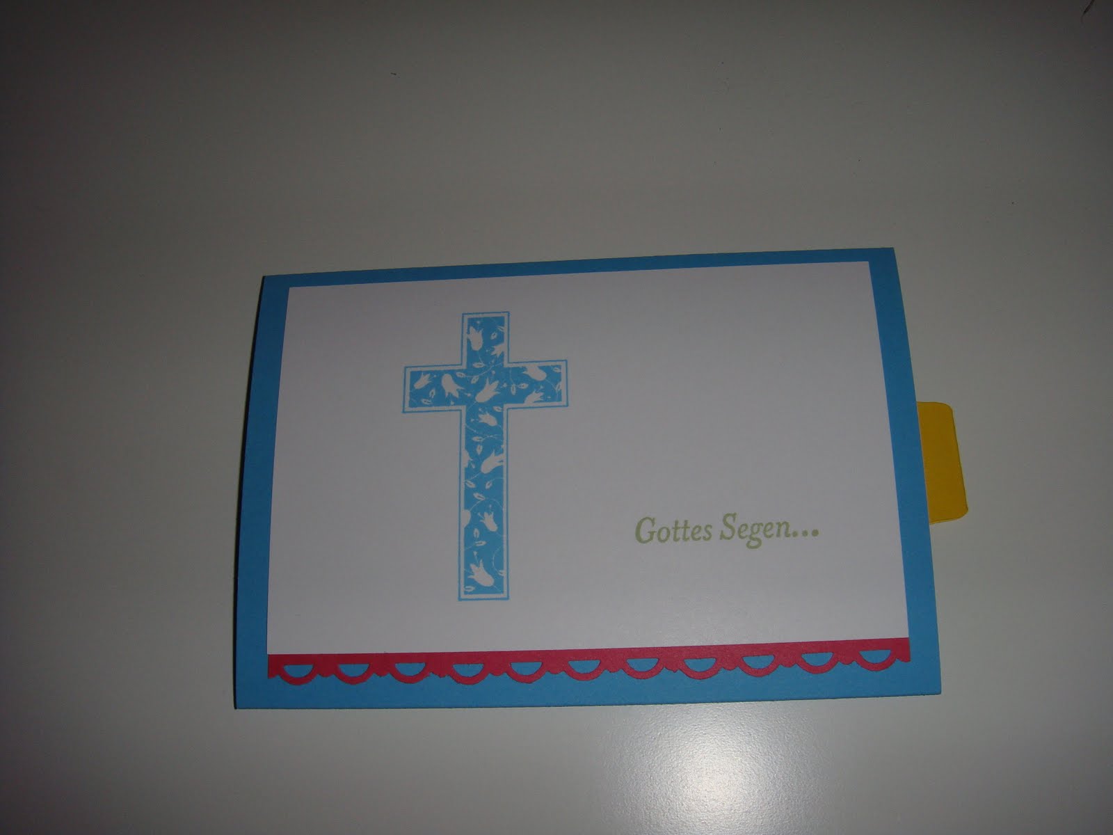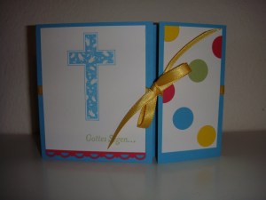 Bereits Anfang April wurde unser kleiner Schatz getauft. So ein Fest will natürlich entsprechend gewürdigt und „bebastelt“ werden. Nach dem Bastelmarathon mit den Geburtsdanksagungskarten hatte ich aber ehrlich gesagt ein kleines kreatives Tief. Ich wollte was besonderes machen, was aber nicht zu aufwändig sein sollte. Und mit den Farben konnte ich mich auch überhaupt nicht entscheiden. Um mal in SU-Sprache zu sprechen: Ich kam von Baiblau und Savanne über Mattgrün und Vanille zu Türkis und Weiß. Wieviel Male ich die Kartenform durchüberlegt hab, kann ich gar nicht sagen, aber es war sehr, sehr oft…