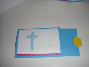 Jetzt müsst Ihr Euch auf dem rausgezogenen Teil den Danksagungstext vorstellen. Und dieser Teil hat dann hinten noch eine Klappe, in der die Fotos drin waren. Zusammengehalten durch das gelbe Stanzteil am Rand. Hmmm, ich kann es echt nicht gut beschreiben…