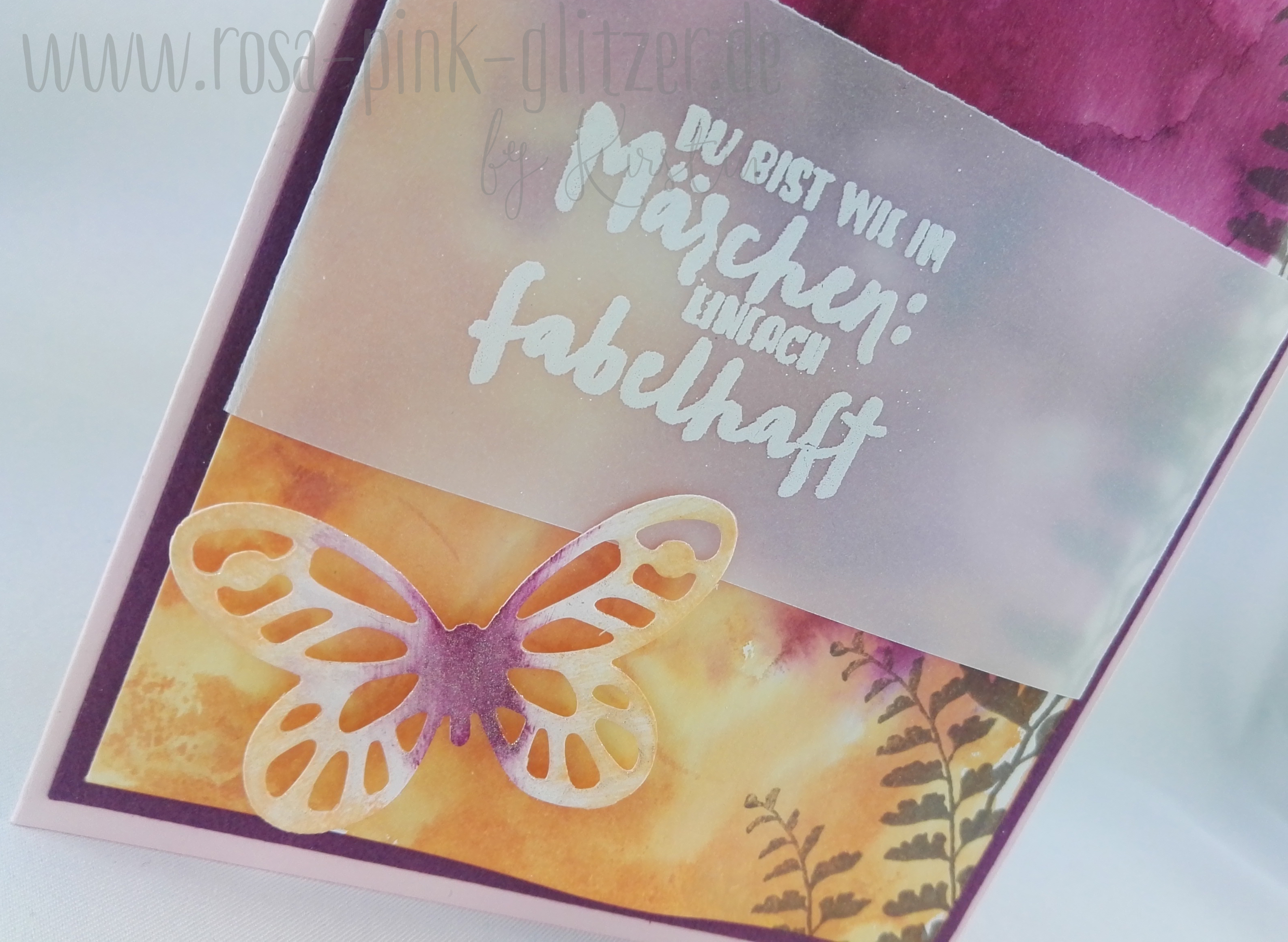 Hier seht Ihr quasi noch eine alte Libelle aus dem Stampin up Stempelset Awesomely Artistic. Ich finde die wunderhübsch, so zart und klein. Ich hab sie einmal direkt auf die Karte gestempelt und dann noch einmal separat auf Flüsterweiß, wo ich nur die Flügel ausgeschnitten habe und an der Spitze nochmal auf die Karte geklebt hab.