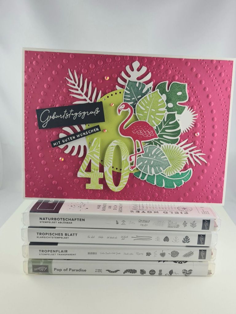 Ich mag diese Art von Karten so gerne. Tropische Blätter, ein Flamingo… hier seht ihr auch den neuen Prägefolder von Stampin up. Der ist so cool und vor allem so groß! Genial!