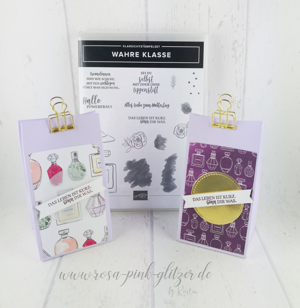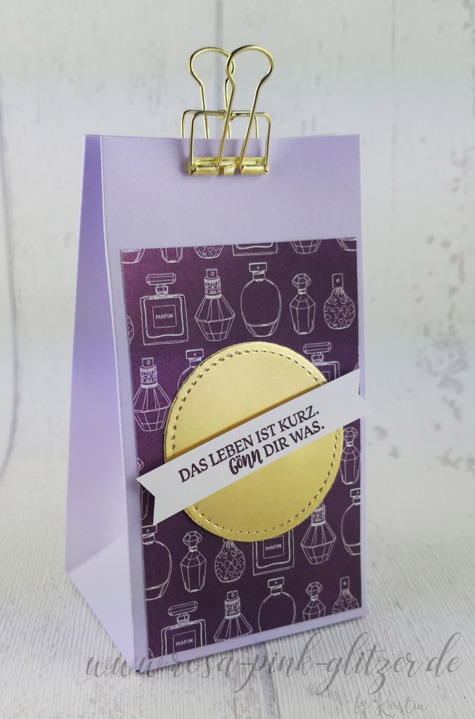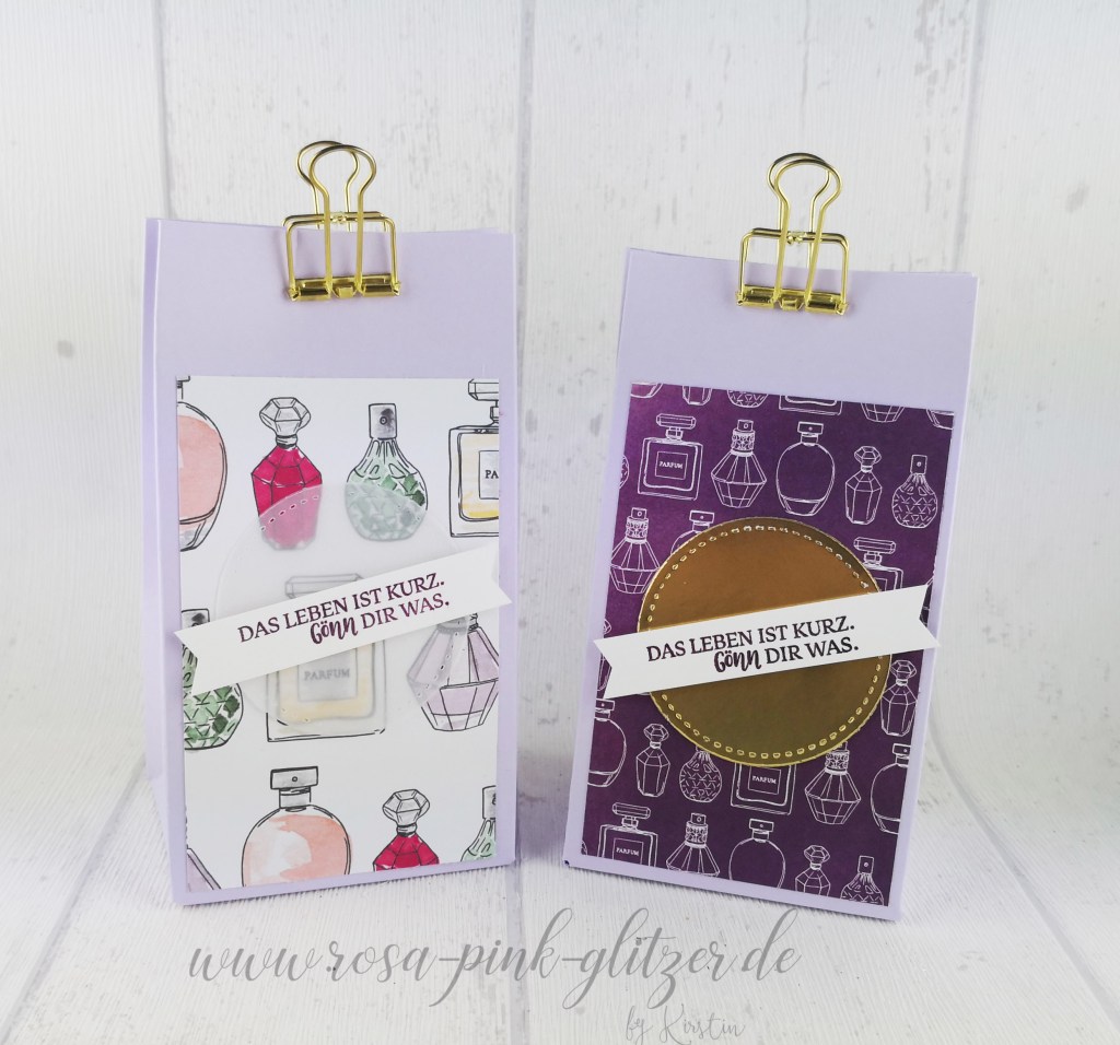 Bei der ersten hab ich das Papier mit den hübschen Parfümfläschchen gewählt. Darauf ein Kreis aus Transparentpapier und ein netter Spruch – fertig.