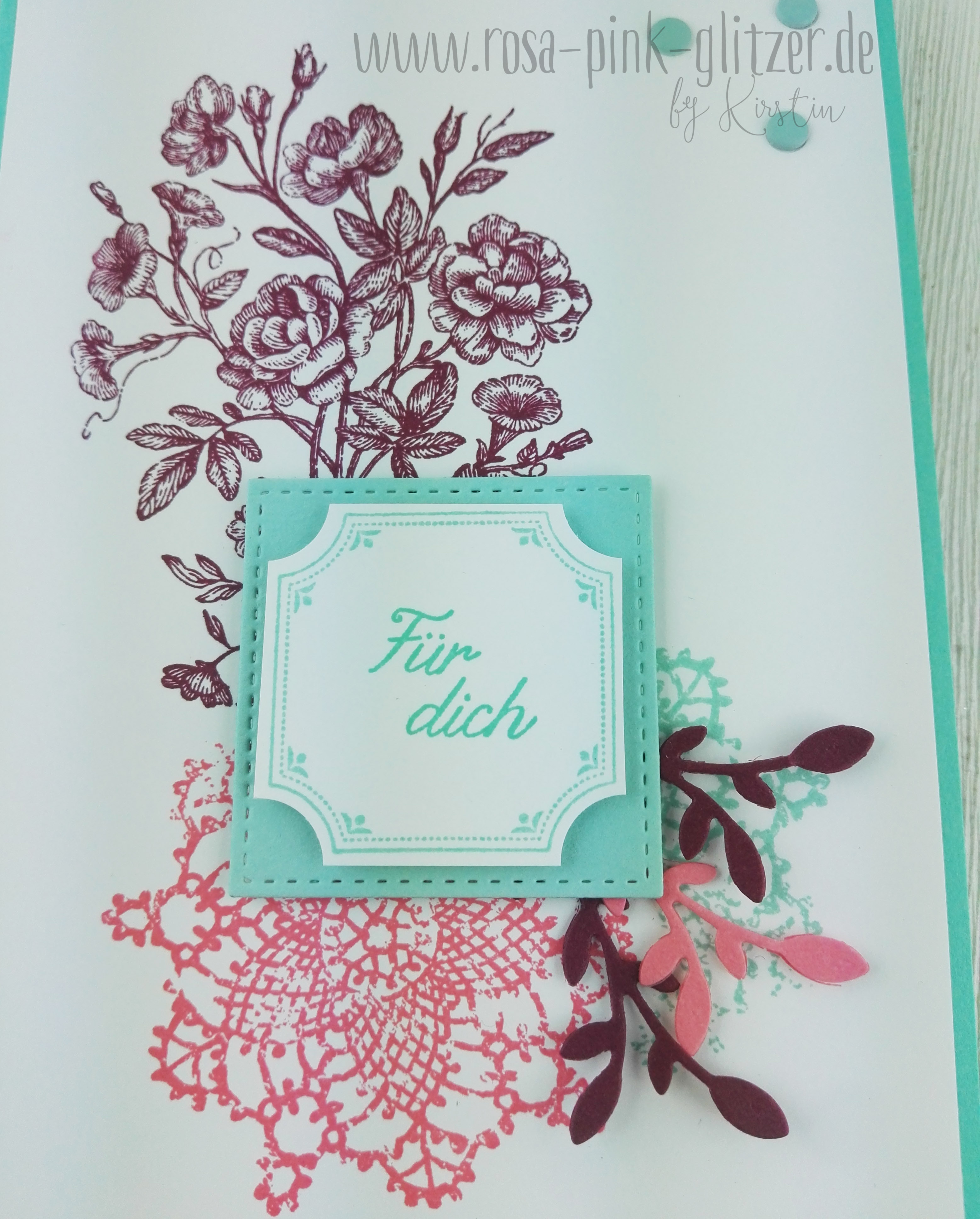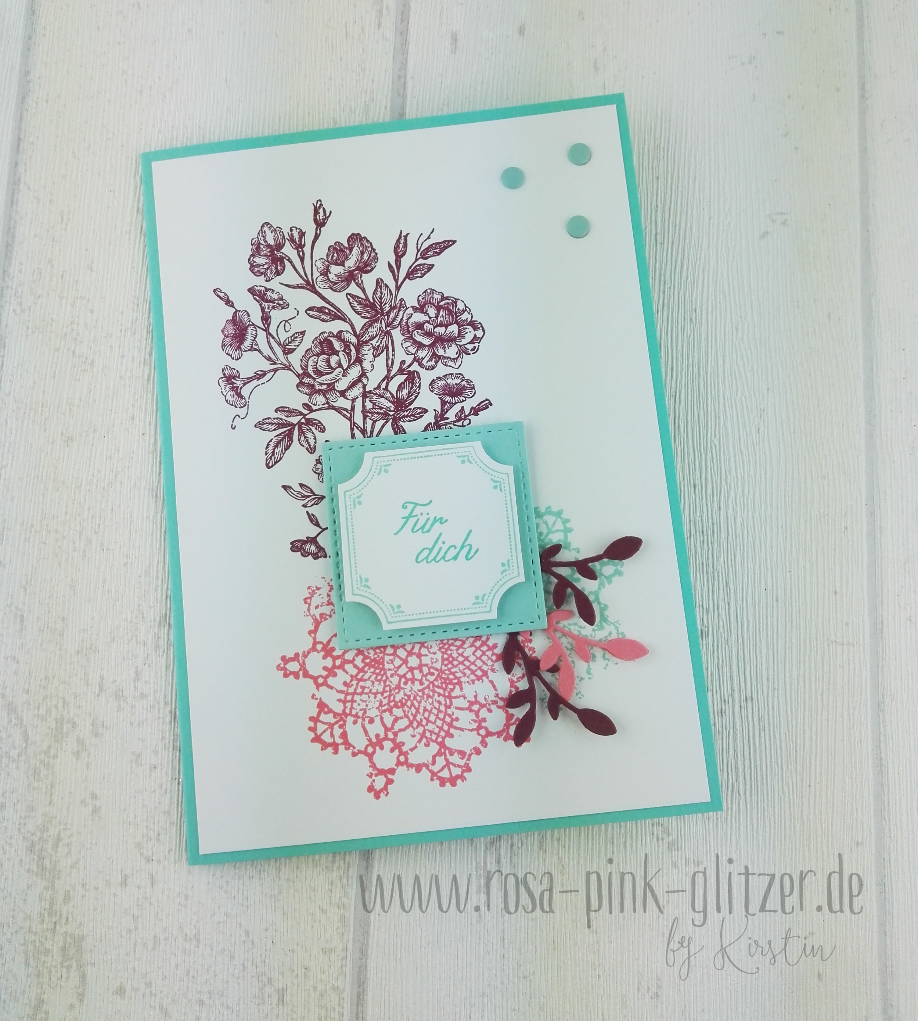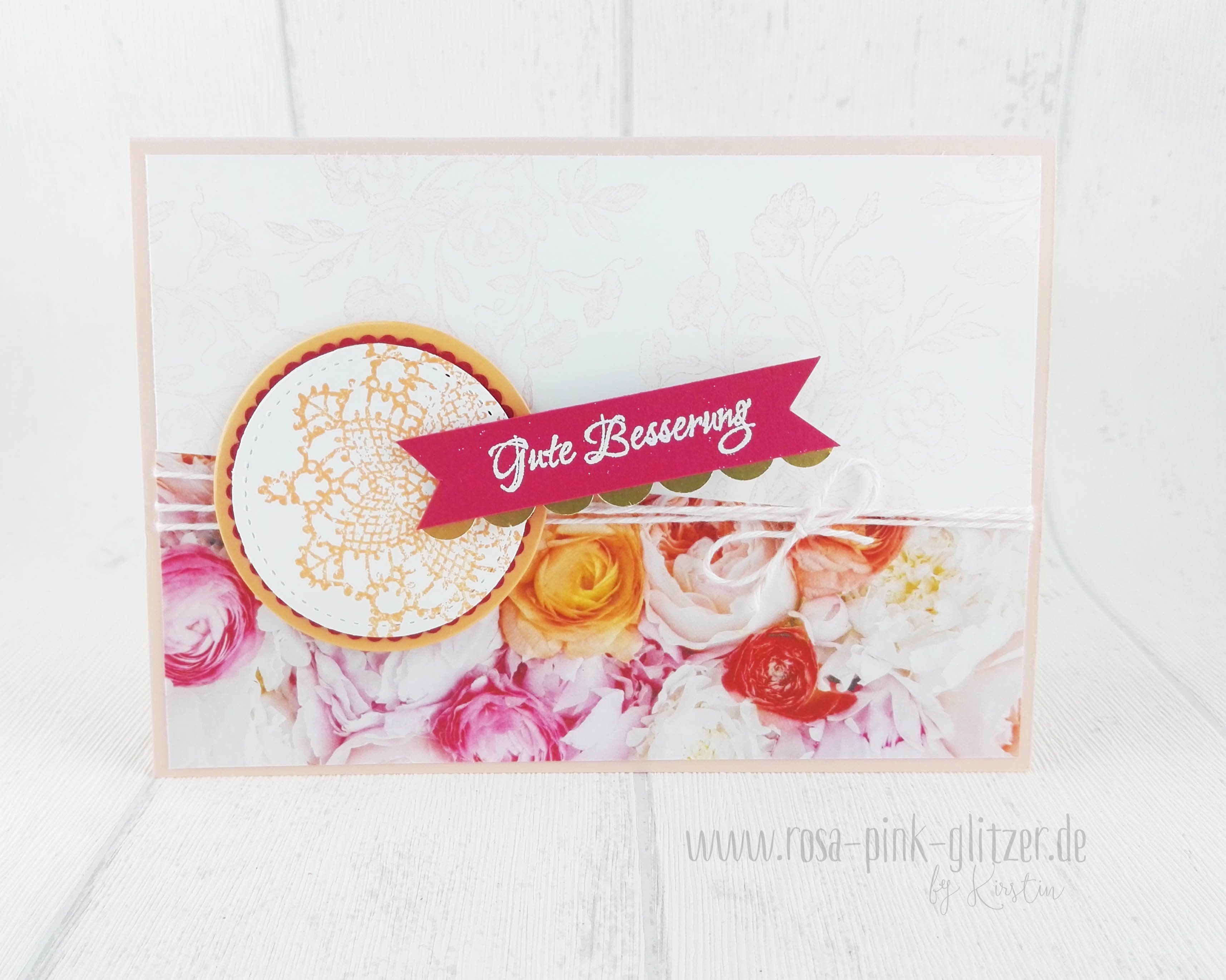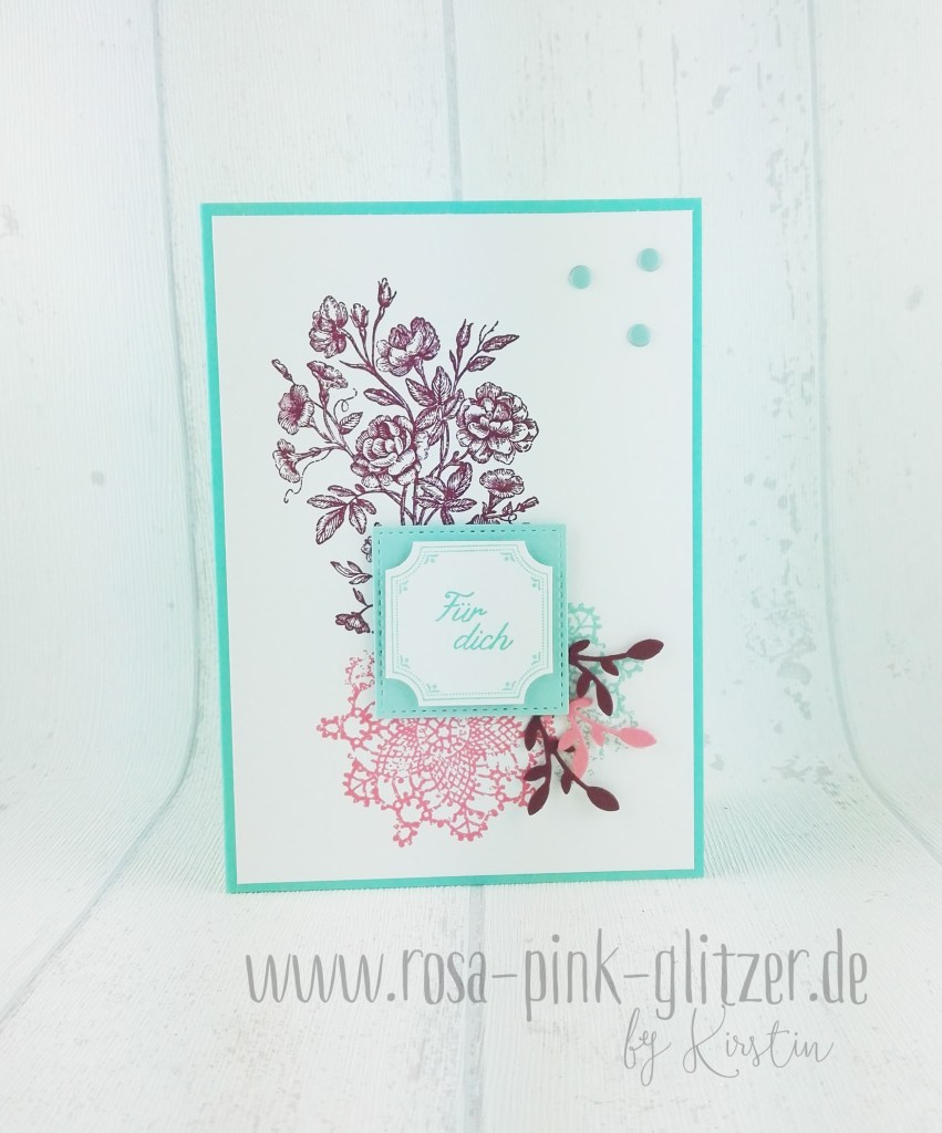 Der Spruch ist in weiß auf Kirschrot embosst. Das hübsche Doily ist in Pfirsich Pur gestempelt. Es stammt aus einem neuen Stempelset für GastgeberInnen: Wahrlich Vintage. Im Hintergrund seht ihr ganz dezent den hübschen Rosenzweig aus dem gleichen Set.