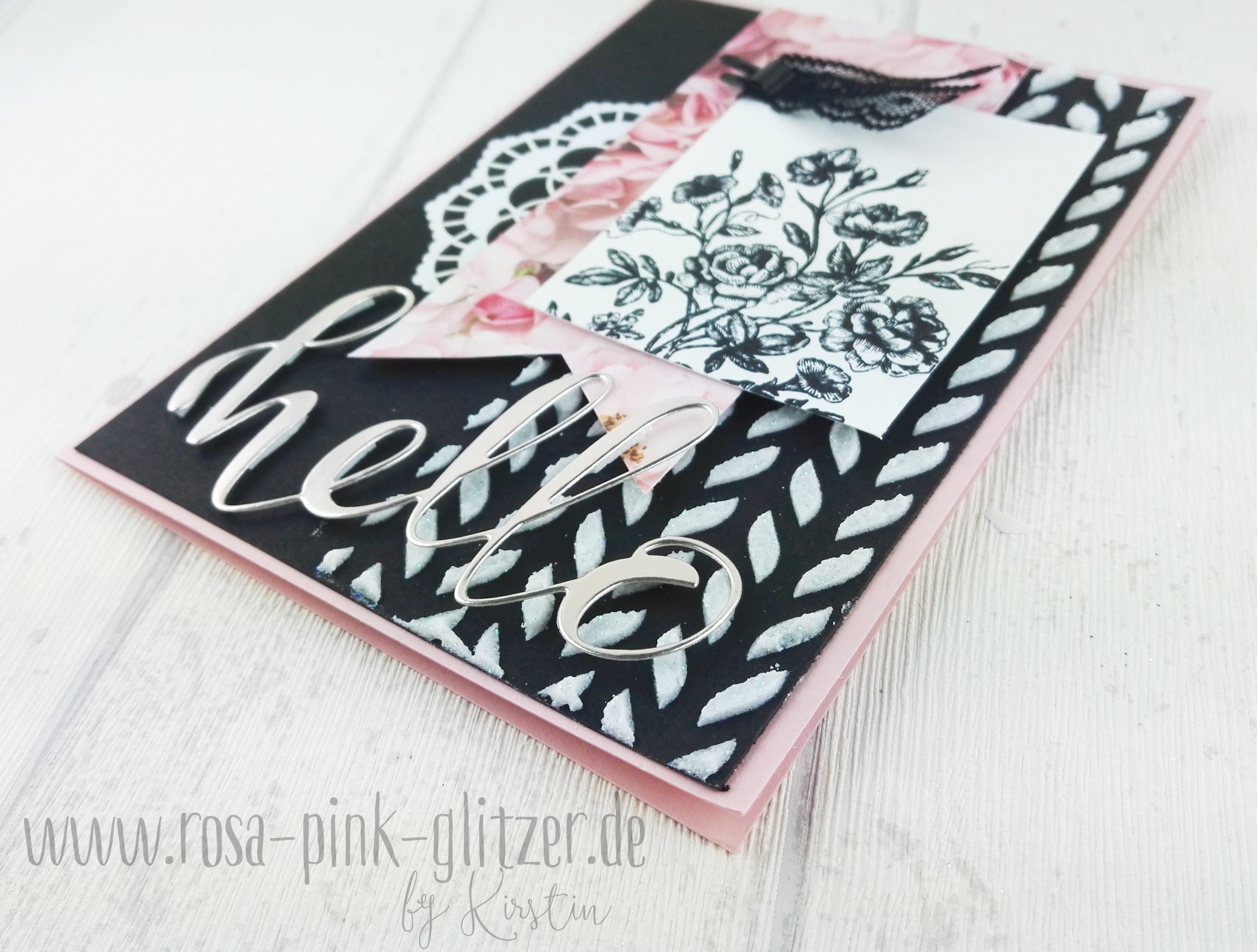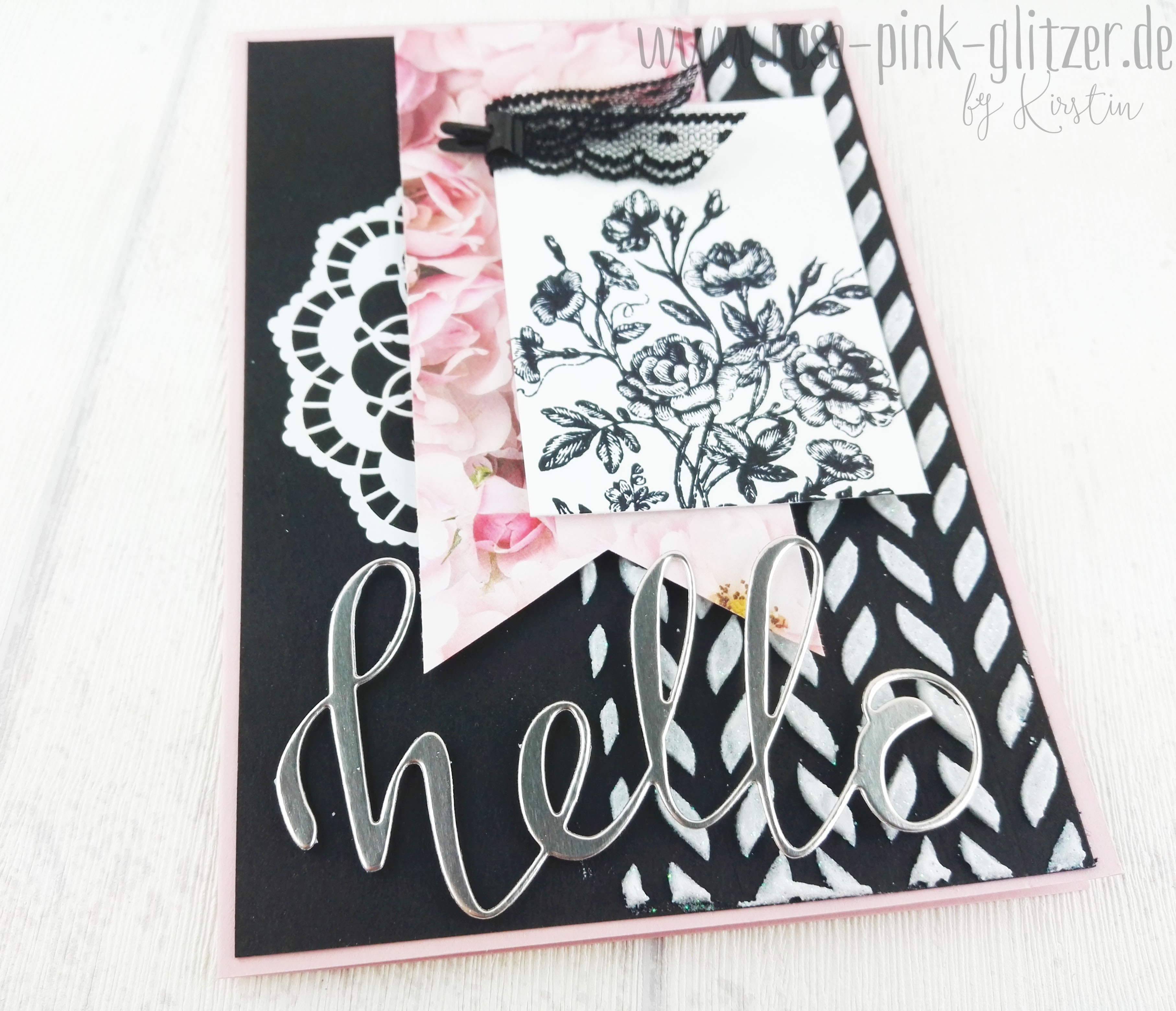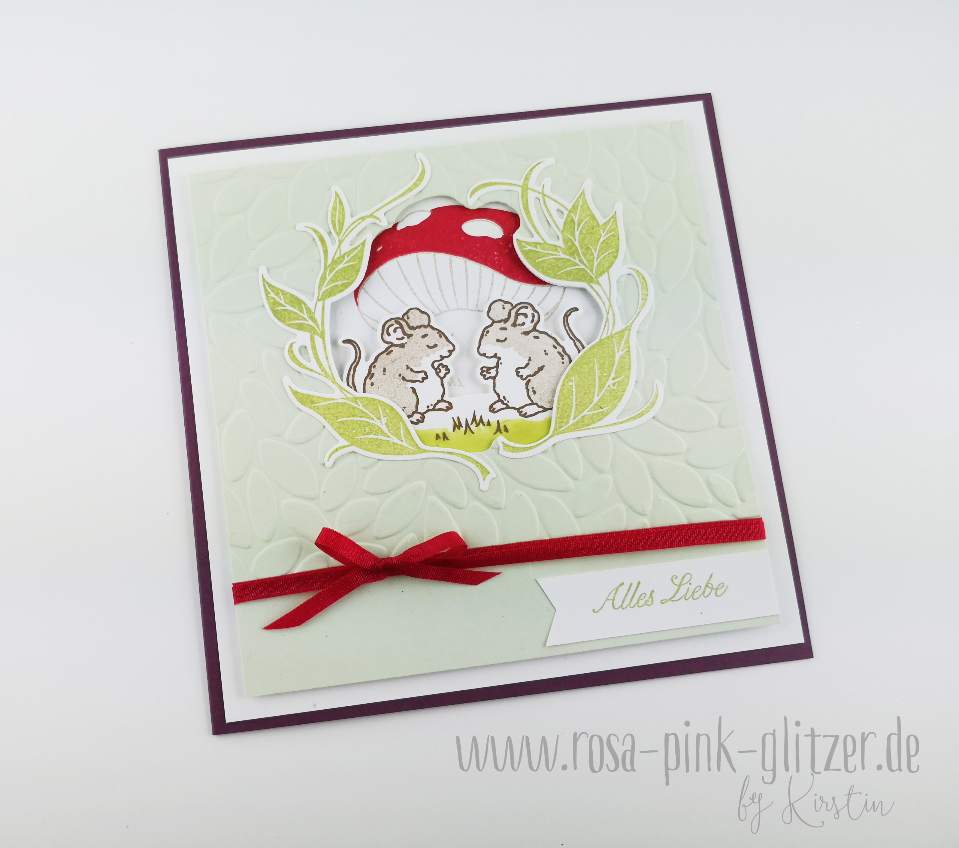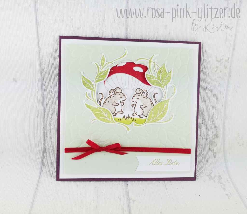 Der Spruch ist in weiß auf Kirschrot embosst. Das hübsche Doily ist in Pfirsich Pur gestempelt. Es stammt aus einem neuen Stempelset für GastgeberInnen: Wahrlich Vintage. Im Hintergrund seht ihr ganz dezent den hübschen Rosenzweig aus dem gleichen Set.