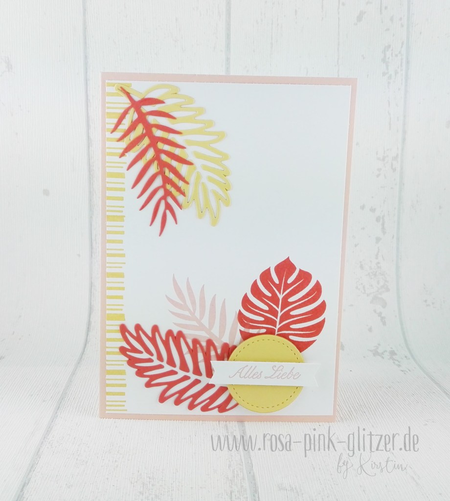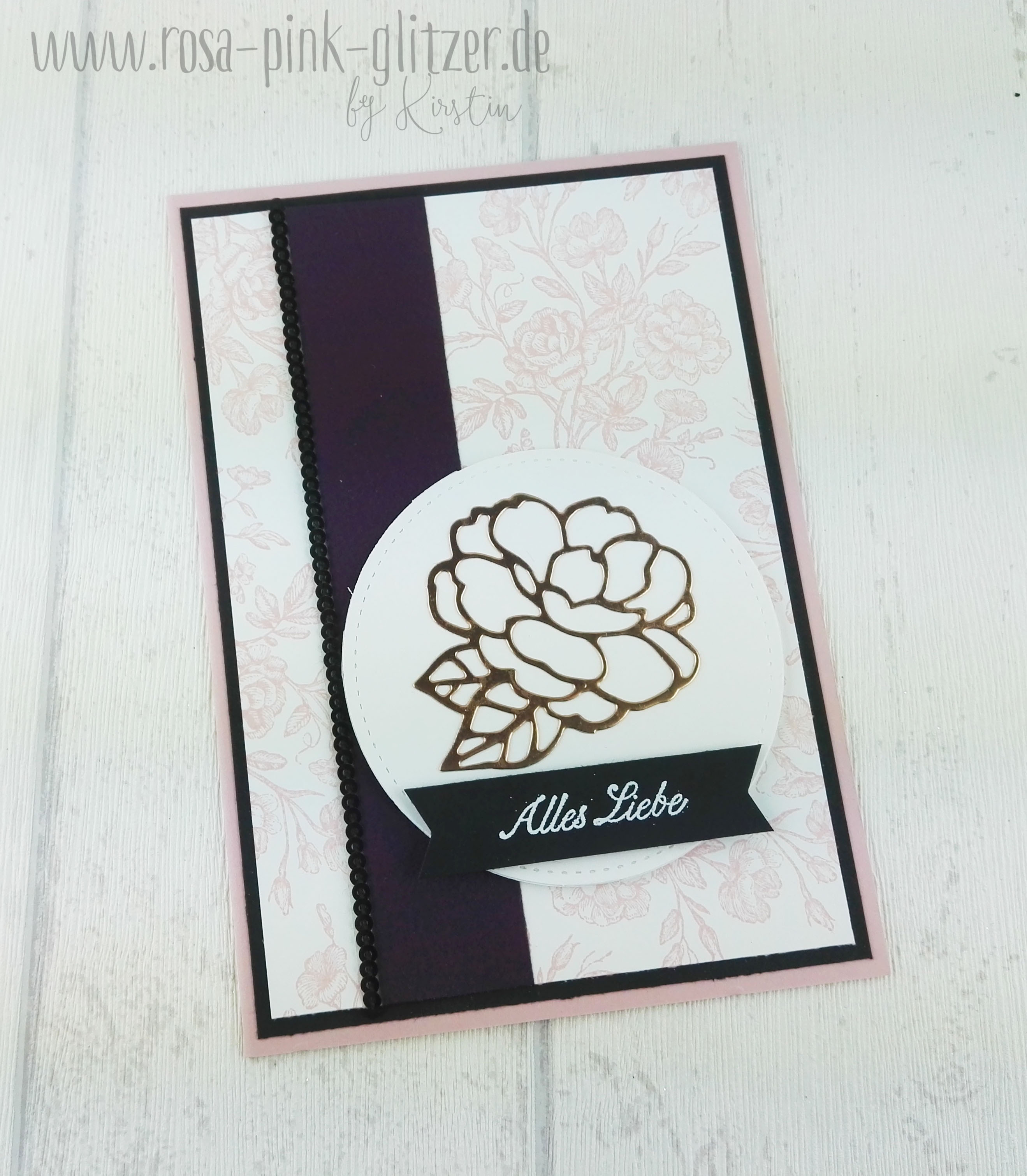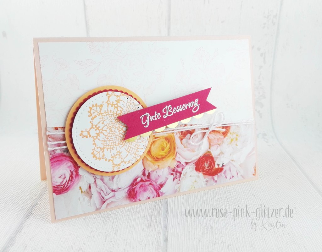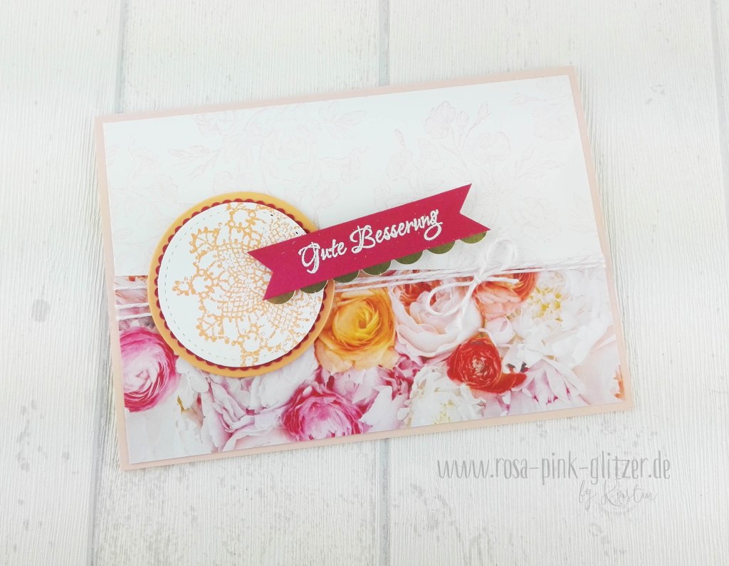 Das Designerpapier ist einfach ein Traum. Dazu hab ich fröhlich alte und neue Farben kombiniert: Blütenrosa, Kussrot, Pfirsich Pur und ein Hauch Gold.
