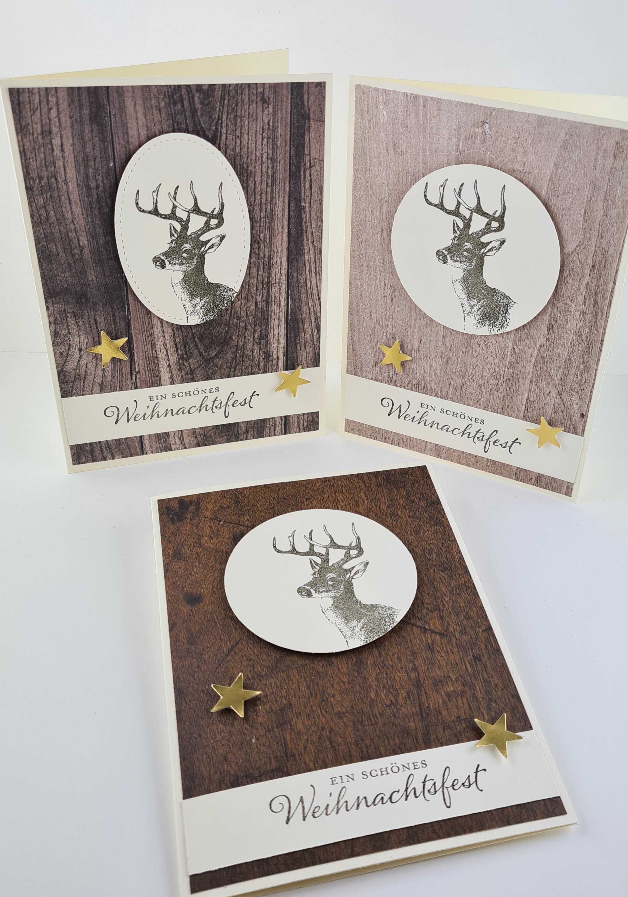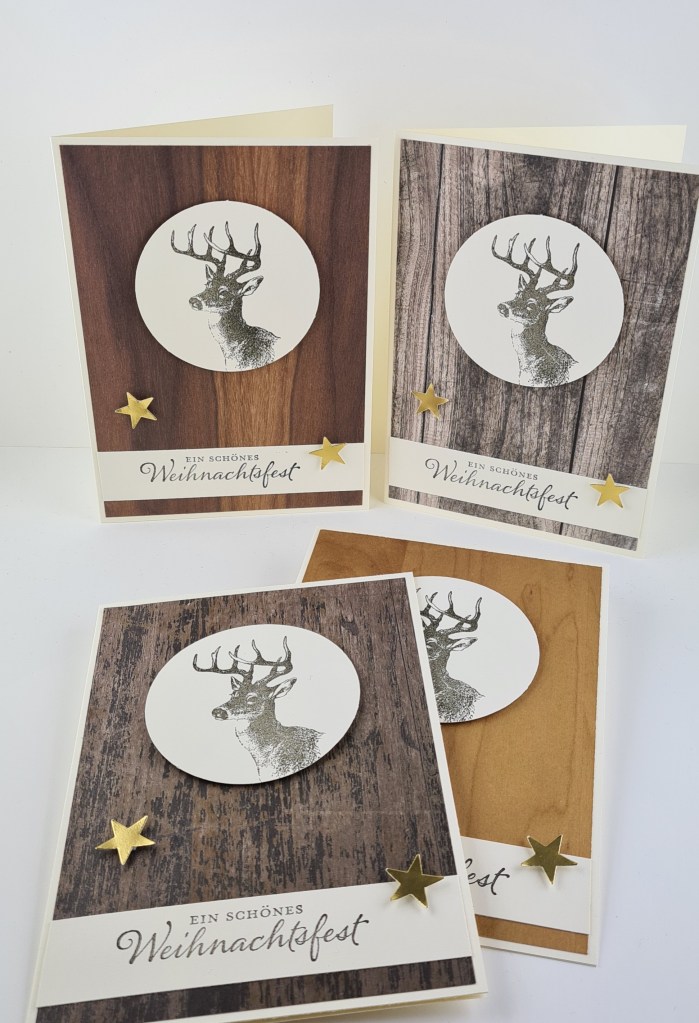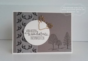 Dann ein wenig rustikal mit Taupe und dem Geweihpapier aus dem „Zauberwald“-Designer-Pergament und den Rentier-Clips. Die Bäume sind aus dem relativ alten aber immer noch erhältlichen Stampin‘ Up! Set „Lovely as a Tree“.