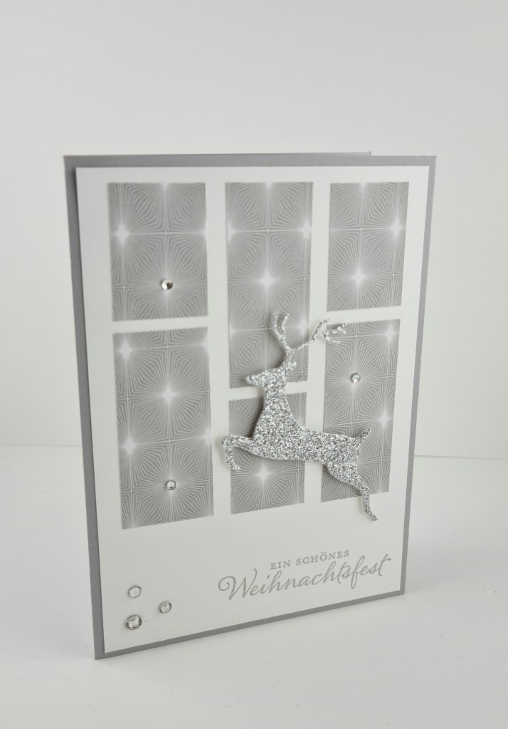 Auch ein Liebling dieses Jahr: Das DSP „Heimelige Weihnachten“. Die Rehe sind doch einfach zum niederknien, oder? Hier wurde fleißig ausgeschnitten und mit dem Wald-Prägefolder – der im nächsten Jahreskatalog wieder dabei sein wird – kombiniert. Dazu ein gestreiftes Band in Chili und ein schlichter Spruch.
